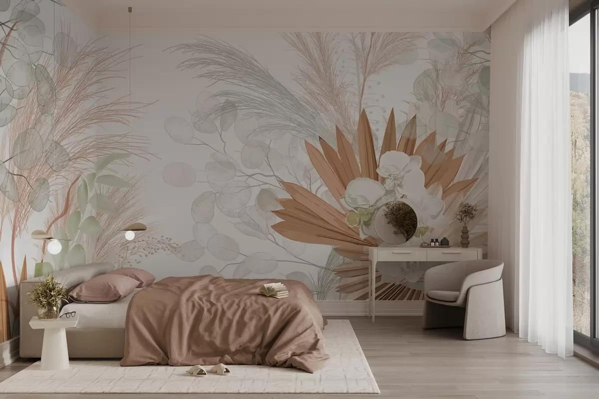 Fototapeten Pampasgras, Eukalyptus, tropische Blätter und Orchideen vor weißem Hintergrund, Pastellfarben Nr. w09366