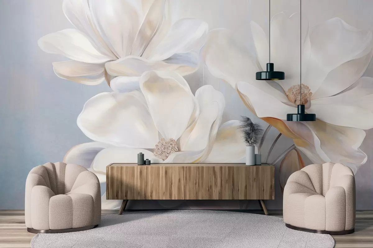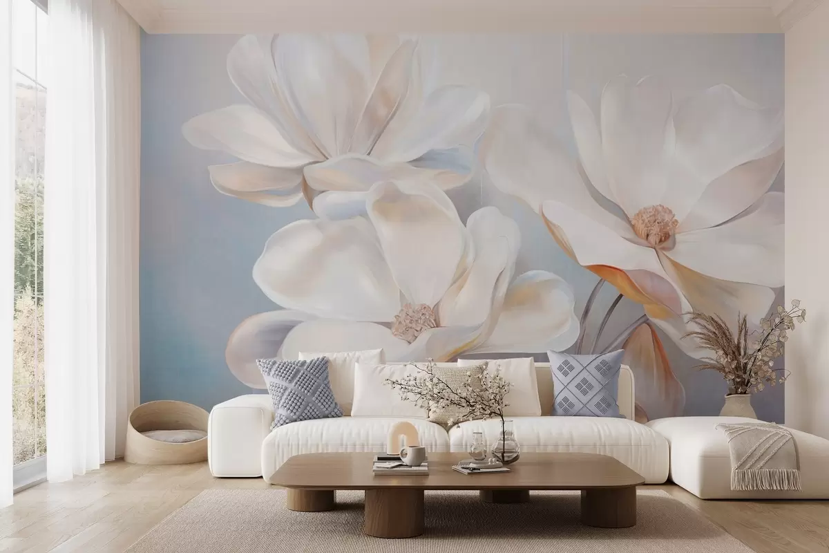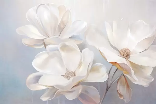 Fototapeten Weiße Fantasie-Magnolienblüten mit zart strukturierten Blütenblättern, ein weicher, abstrakter Hintergrund Nr. w09373