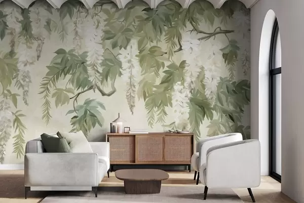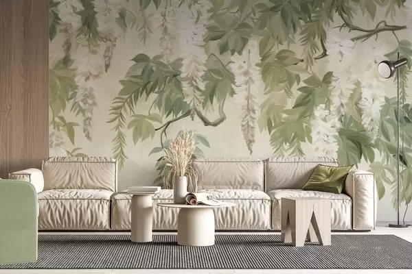 Fototapeten Glyzinienzweige mit weißen Blüten und grünen Blättern, grüner Hintergrund, strukturierter Vintage-Malstil Nr. w09375