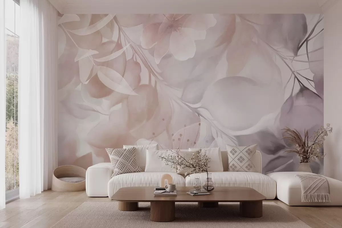 Fototapeten Blumenkunst mit gedeckten beige- und braunen Blumen, Blättern und Zweigen, sanften Pastellfarben und Aquarell-Struktureffekt Nr. w09397