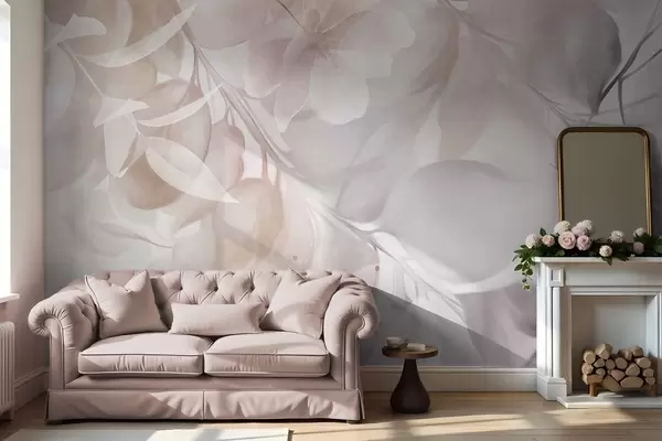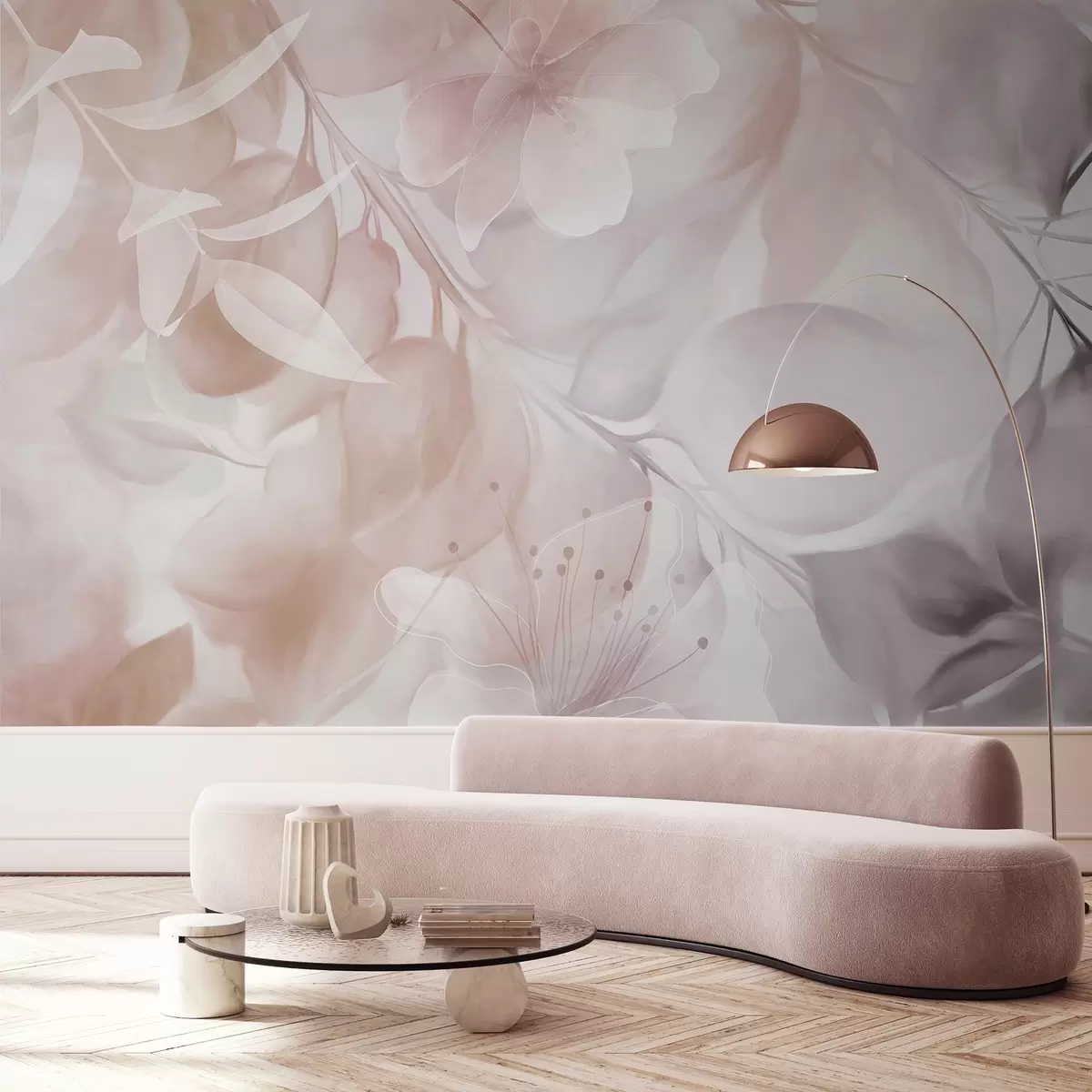 Fototapeten Blumenkunst mit gedeckten beige- und braunen Blumen, Blättern und Zweigen, sanften Pastellfarben und Aquarell-Struktureffekt Nr. w09397