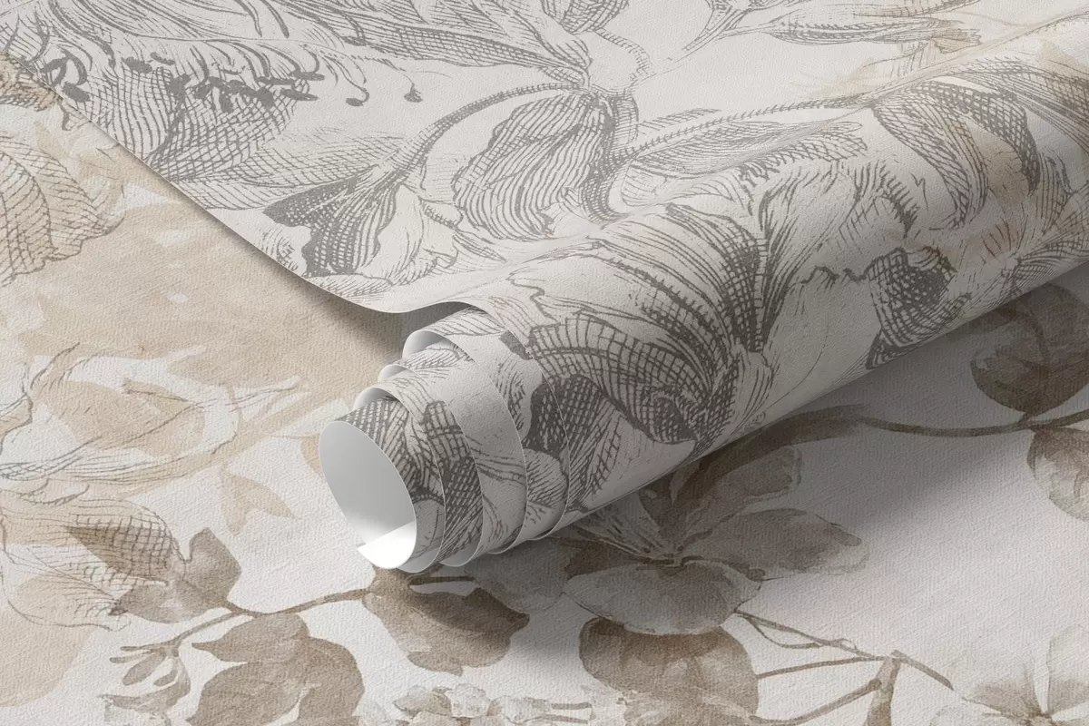 Fototapeten Vintage-Blumenkunst mit strukturierter Oberfläche, zarten Gartenblumen und Blattillustrationen im Zeichenstil, sanften Pastelltönen in Beige und Sepia Nr. w09402