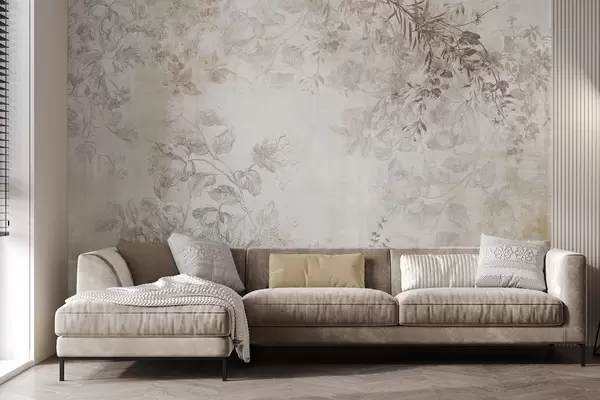 Fototapeten Vintage-Blumenkunst mit strukturierter Oberfläche, zarten Gartenblumen und Blattillustrationen im Zeichenstil, sanften Pastelltönen in Beige und Sepia Nr. w09402