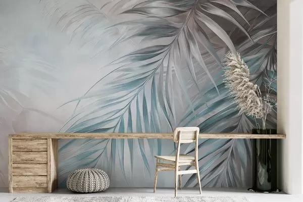 Fototapeten Palmblätter in Grau- und Blautönen, heller strukturierter Hintergrund mit sanften Farben, eleganter tropischer Stil Nr. w09475v1