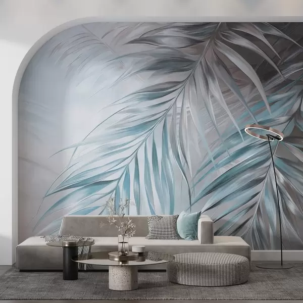 Fototapeten Palmblätter in Grau- und Blautönen, heller strukturierter Hintergrund mit sanften Farben, eleganter tropischer Stil Nr. w09475v1