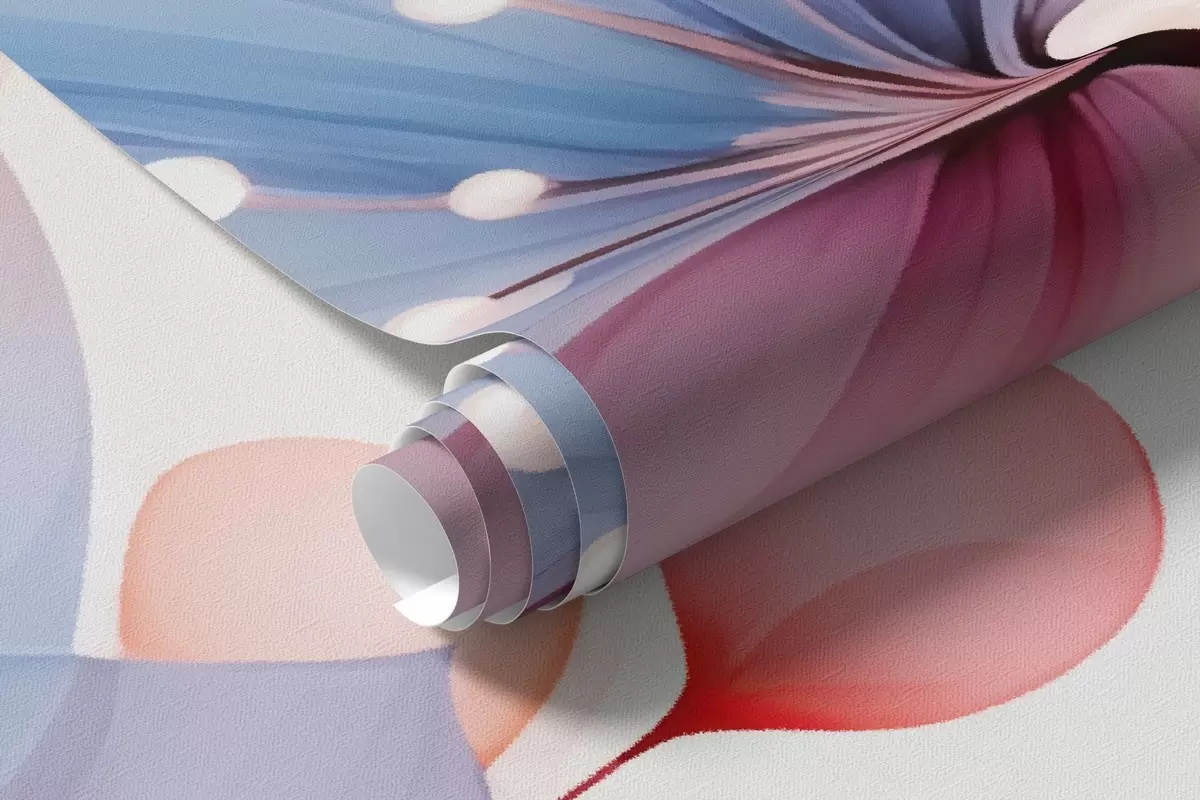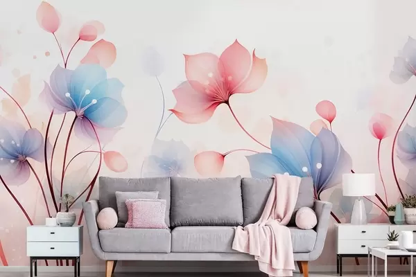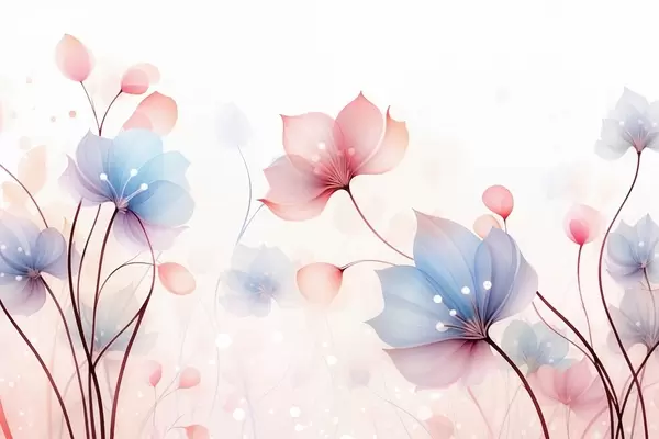 Fototapeten Zarte rosa-blaue Blumen – luftige Flora auf weißem Aquarellhintergrund Nr. w09507
