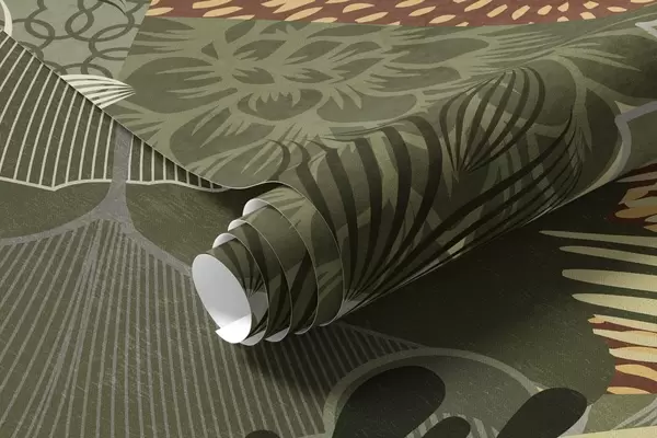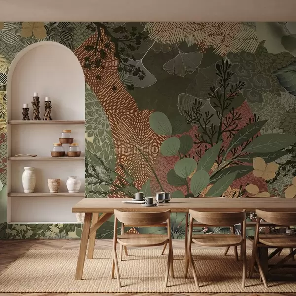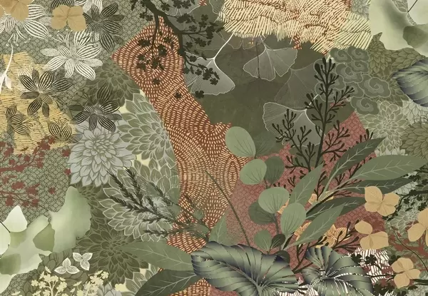 Fototapeten Abstrakte Collage mit botanischen Elementen wie Blättern, Blumen und organischen Texturen in Grün- und Brauntönen Nr. w09545