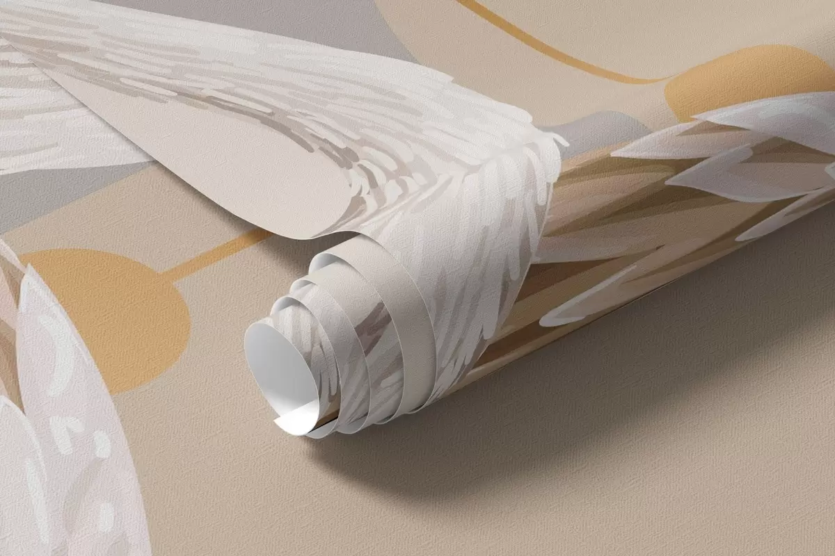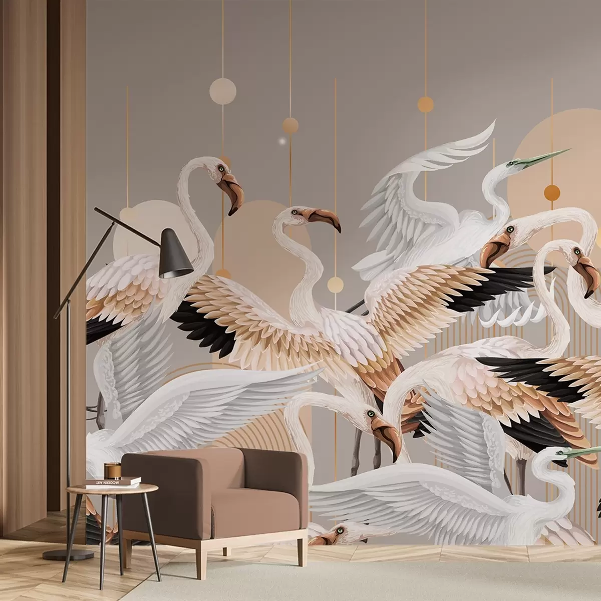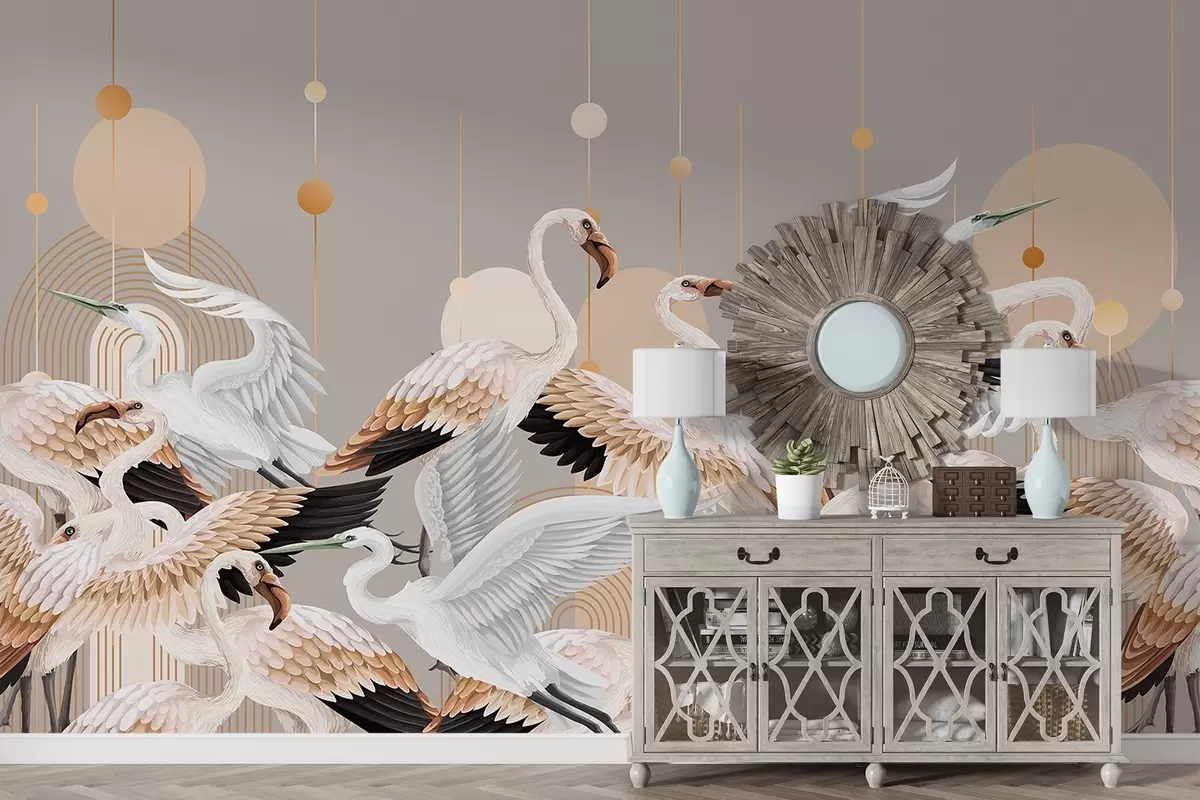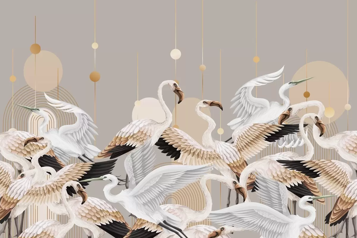Fototapeten Eine Schar weißer Flamingos mit zarten Flügeln vor einem neutralen Hintergrund mit gelben Linien und Kreisen Nr. w09546v1