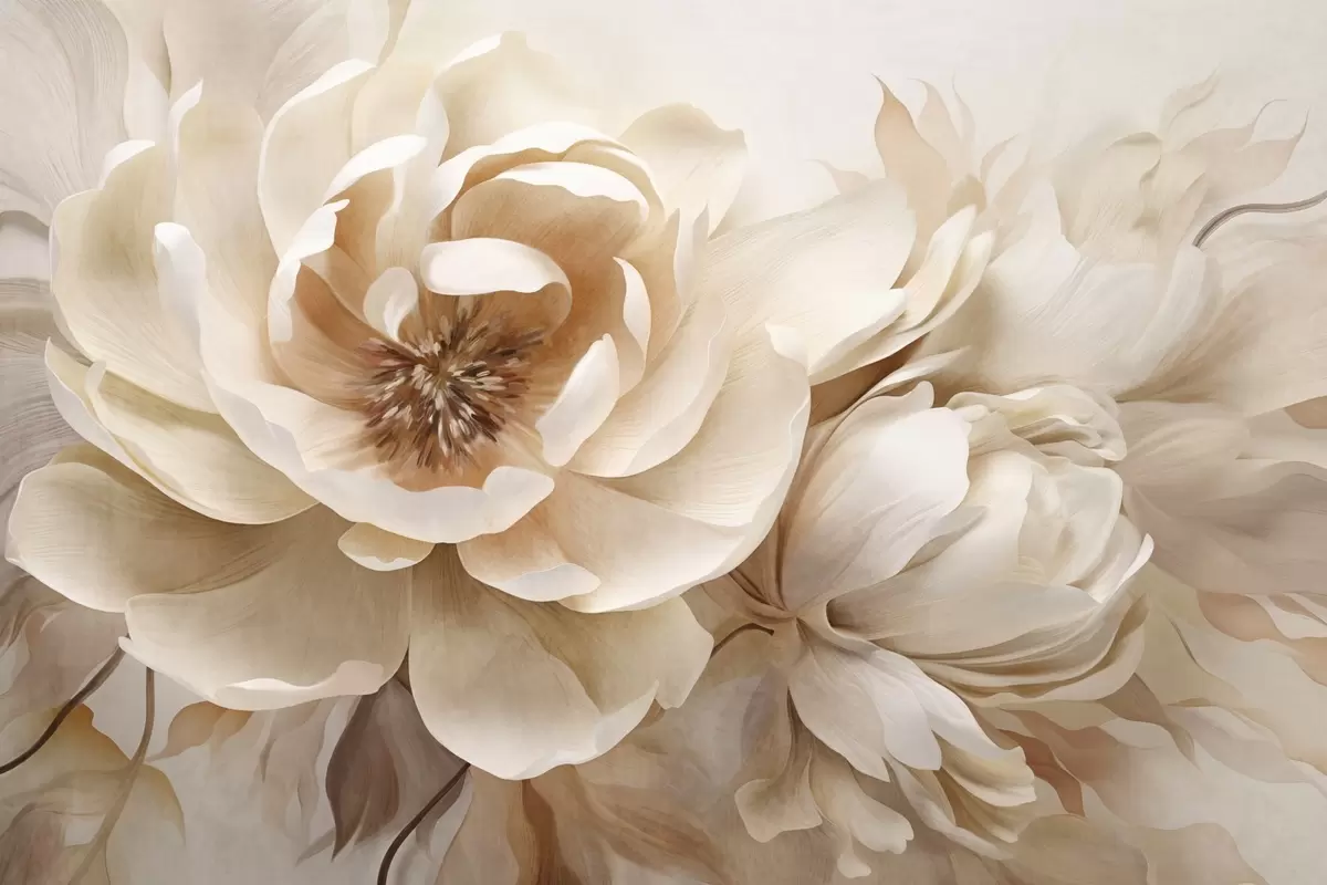 Fototapeten Cremige Pfingstrosen mit braunen Blütenkernen und Blättern vor einem verschwommenen, hellen, abstrakten Hintergrund Nr. w09554
