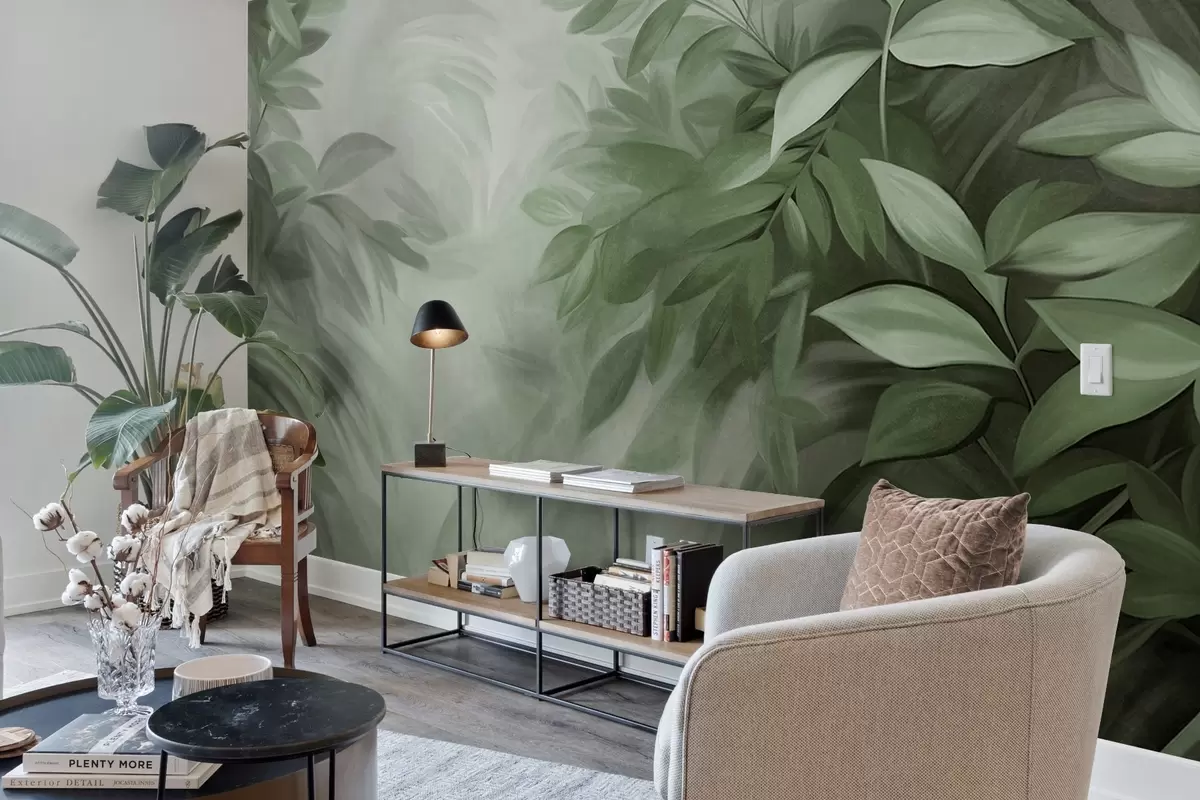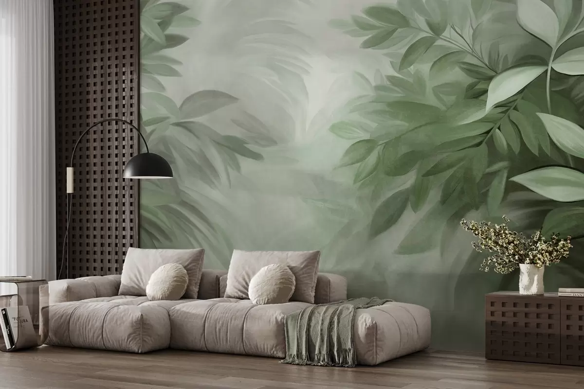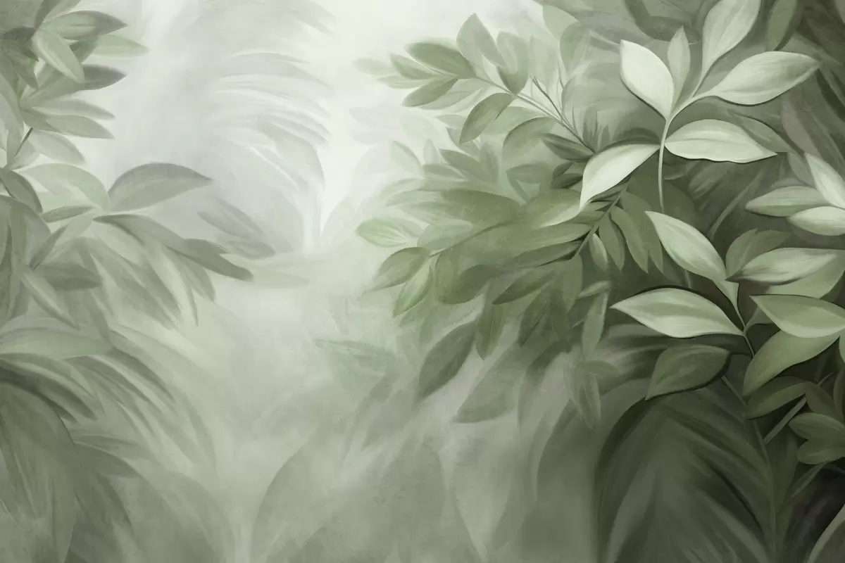 Fototapeten Grüne und graue Blätter mit weicher, verschwommener Textur, in einem malerischen Stil mit sichtbaren Pinselstrichen Nr. w09584v1