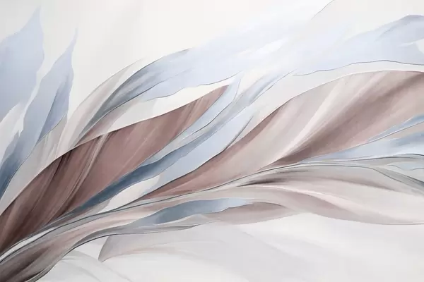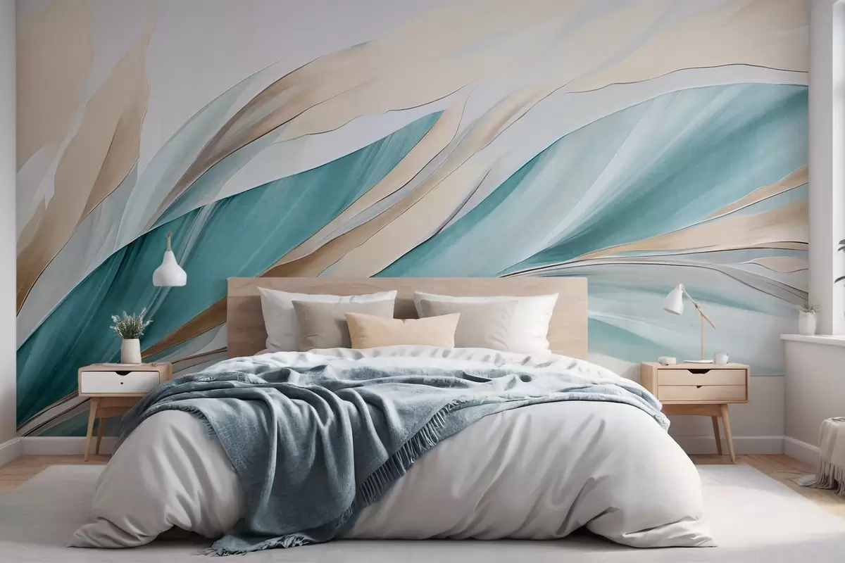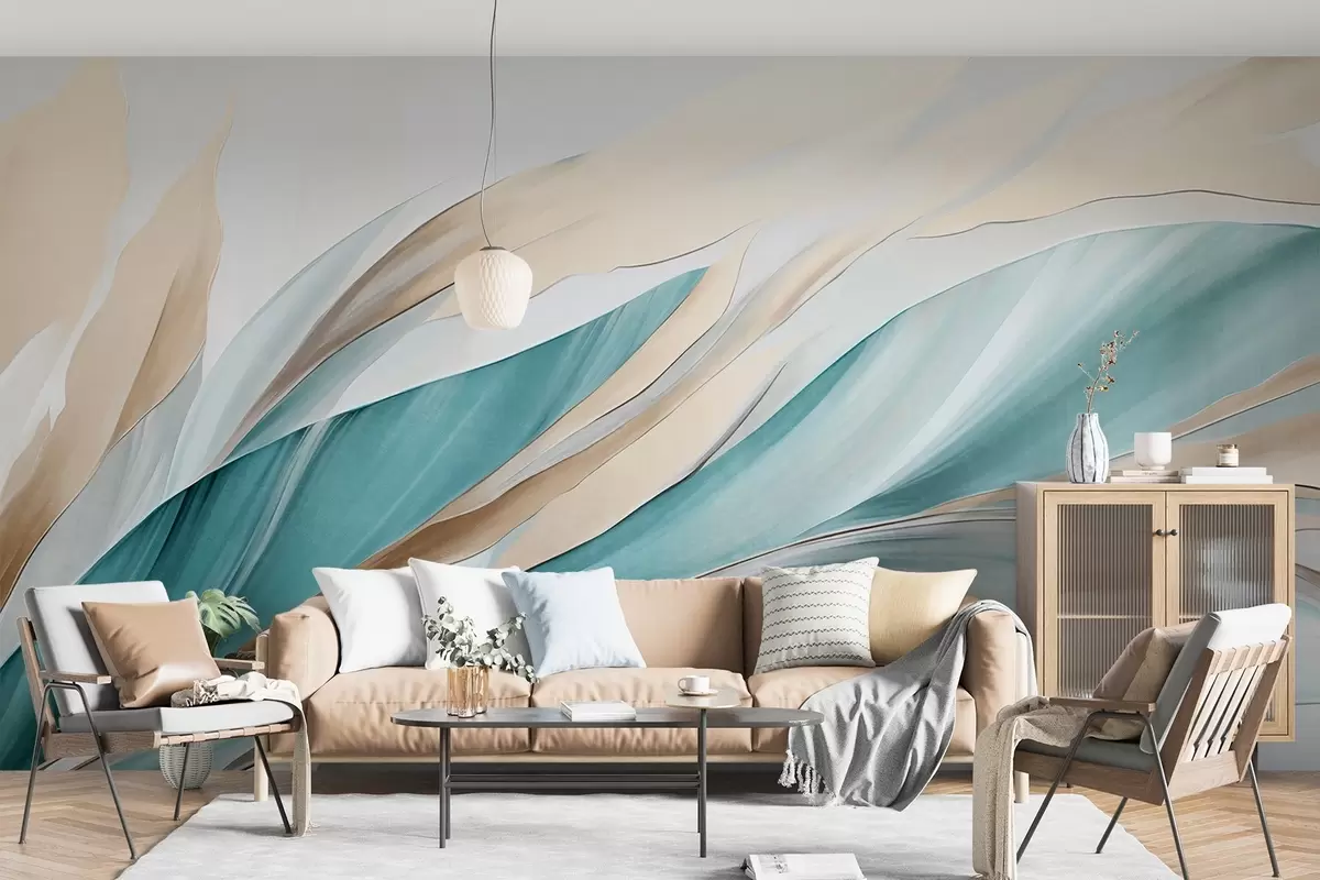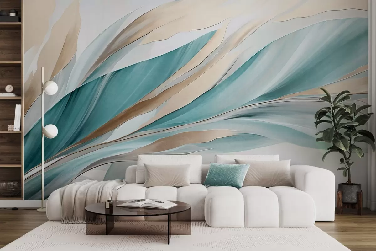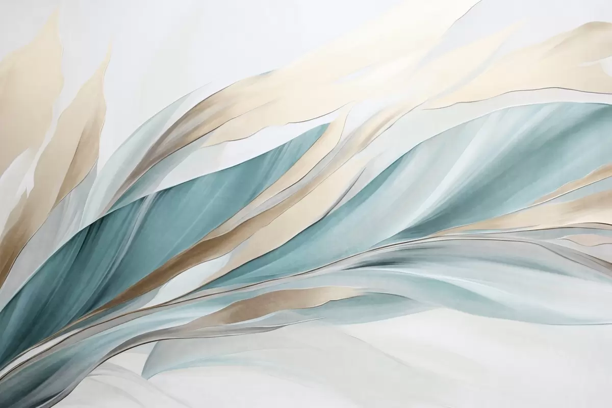 Fototapeten Abstrakte, fließende Wellen in Blaugrün und Gelb, mit dünnen Formen und Linien, vor weißem Hintergrund, strukturierte Kunst Nr. w09585