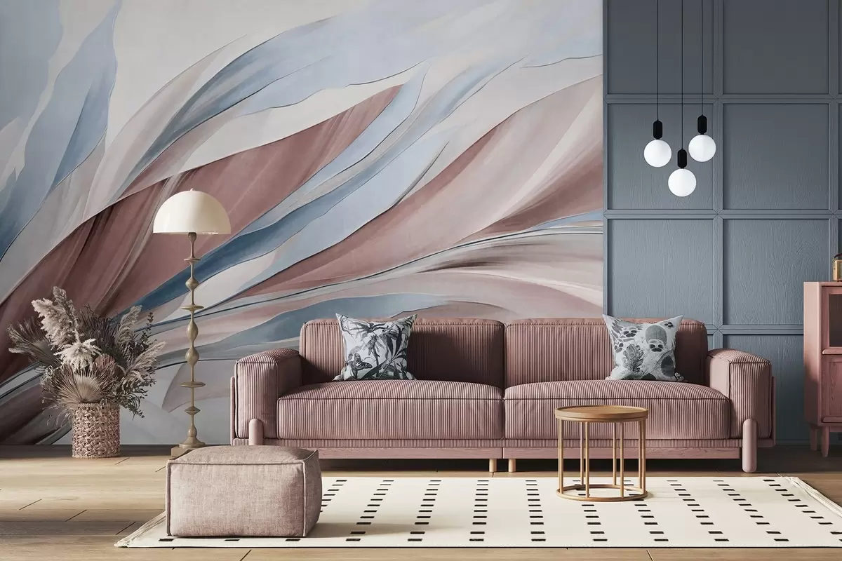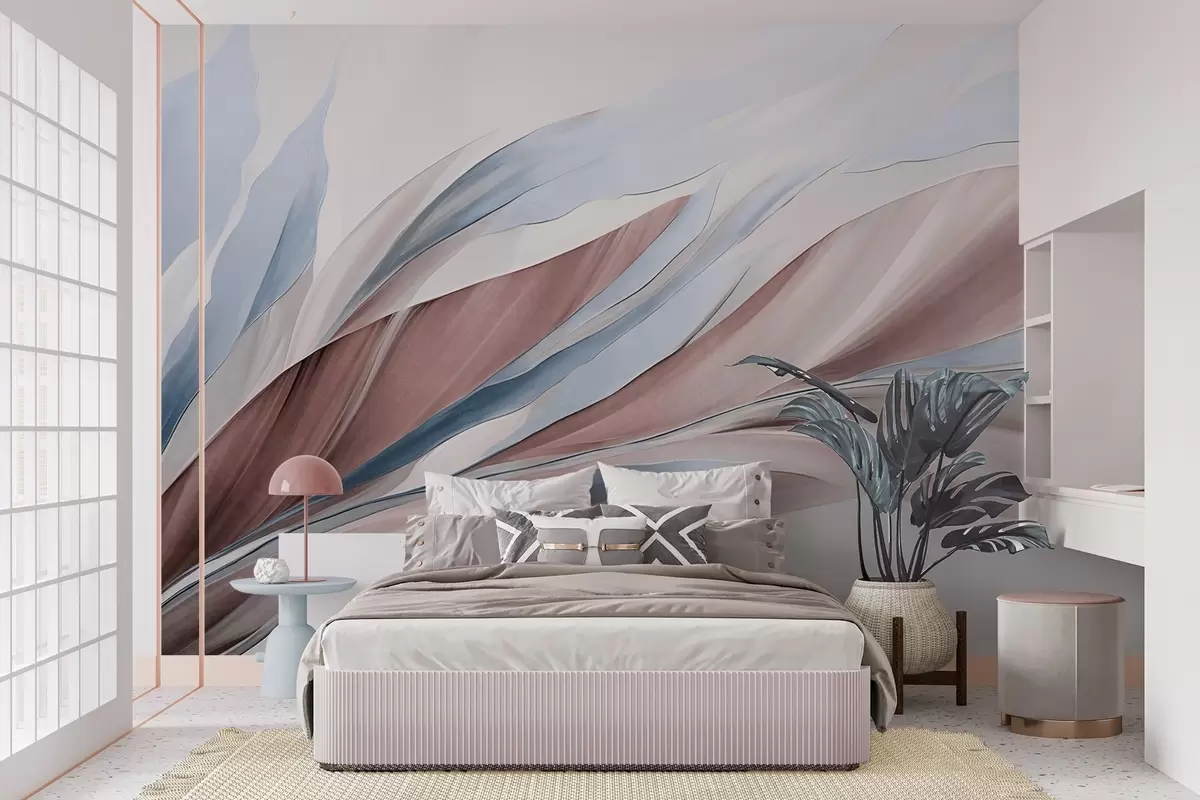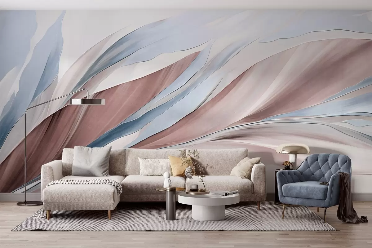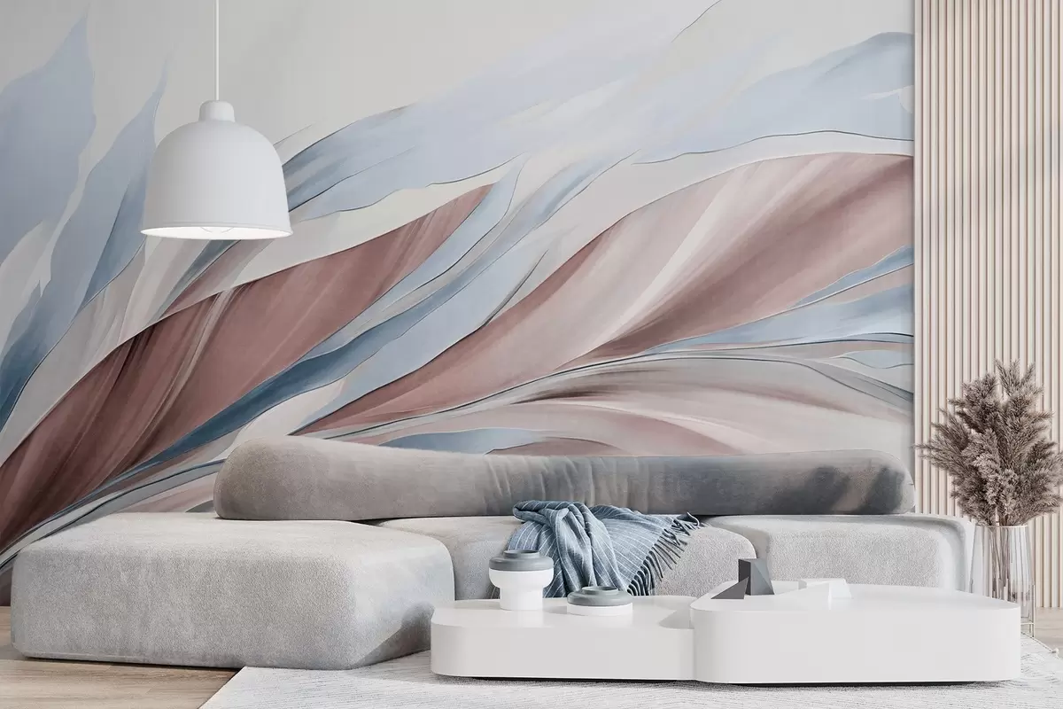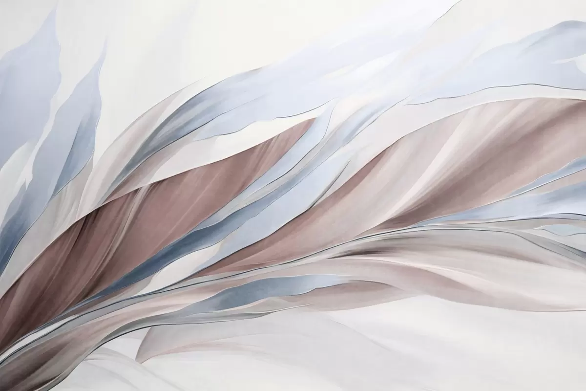 Fototapeten Abstrakte, fließende Wellen in Blau und Braun mit dünnen Formen und Linien vor weißem Hintergrund, strukturierte Kunst Nr. w09585v1