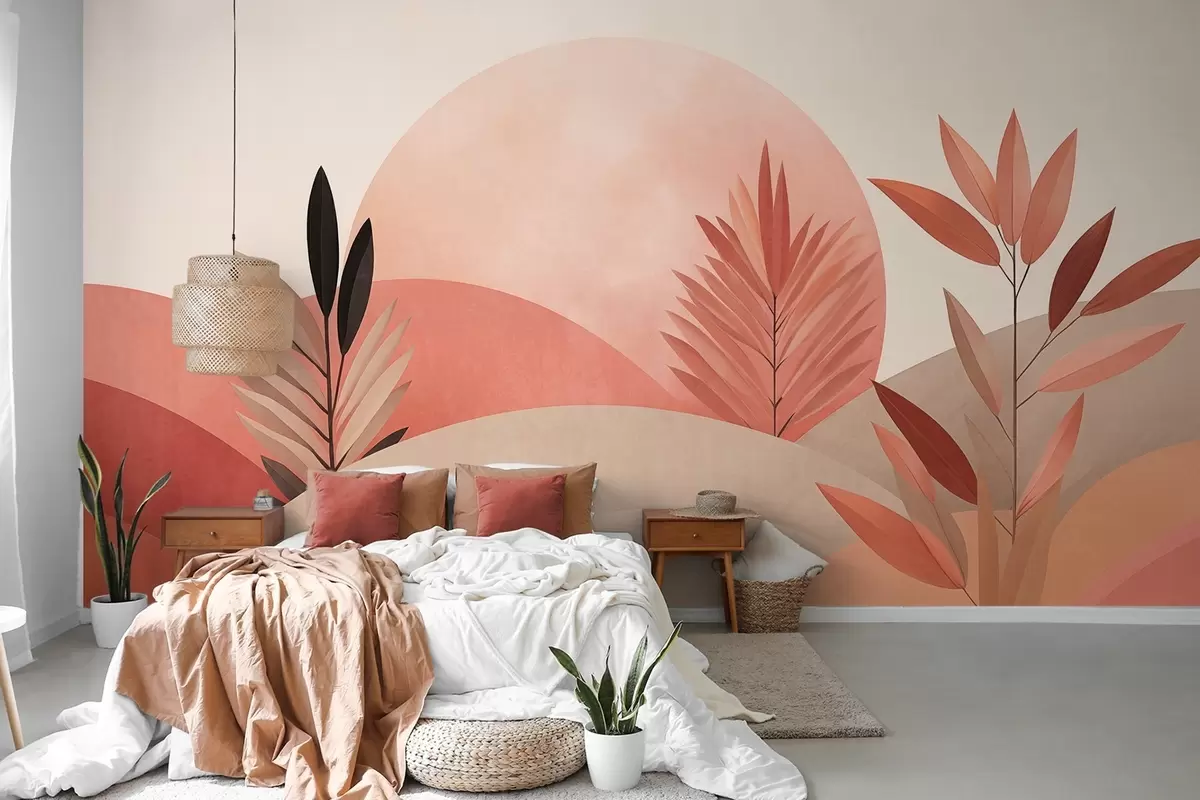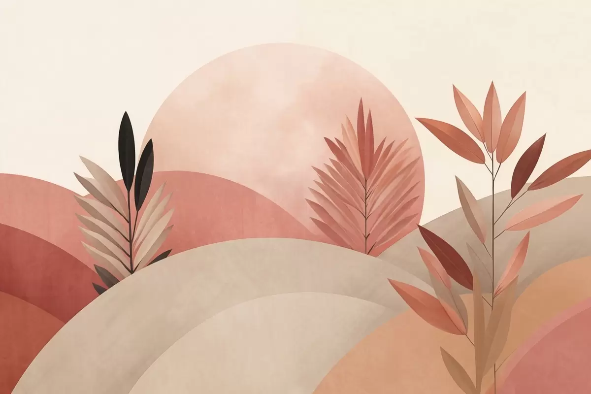 Fototapeten Abstrakte Boho-Landschaft, Sonne hinter sanften Hügeln, Pflanzen im Vordergrund, minimalistisch, strukturiert, gedeckte Farben Nr. w09608