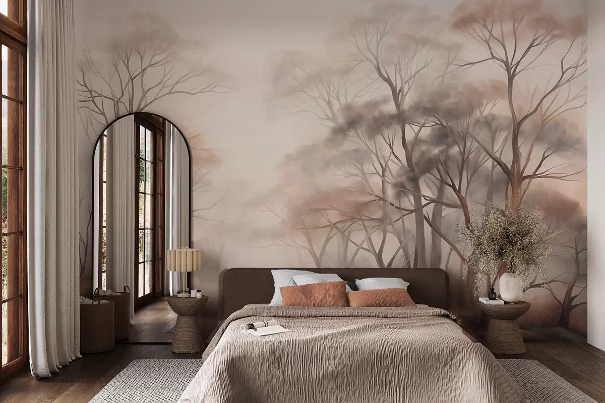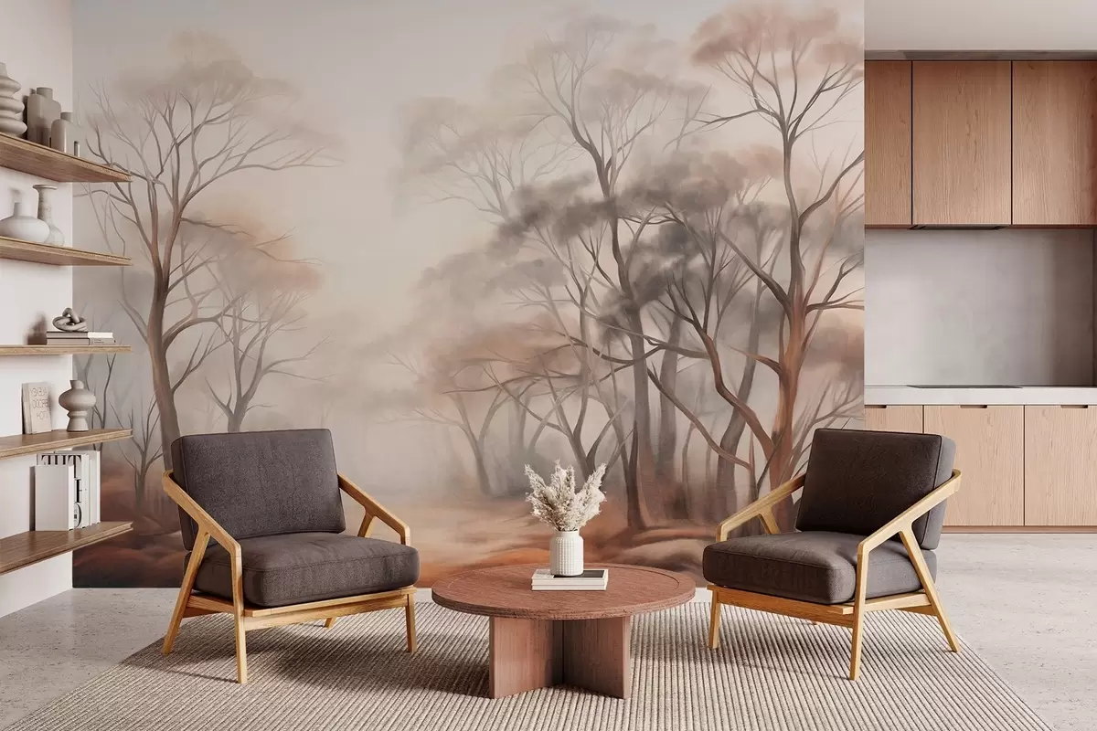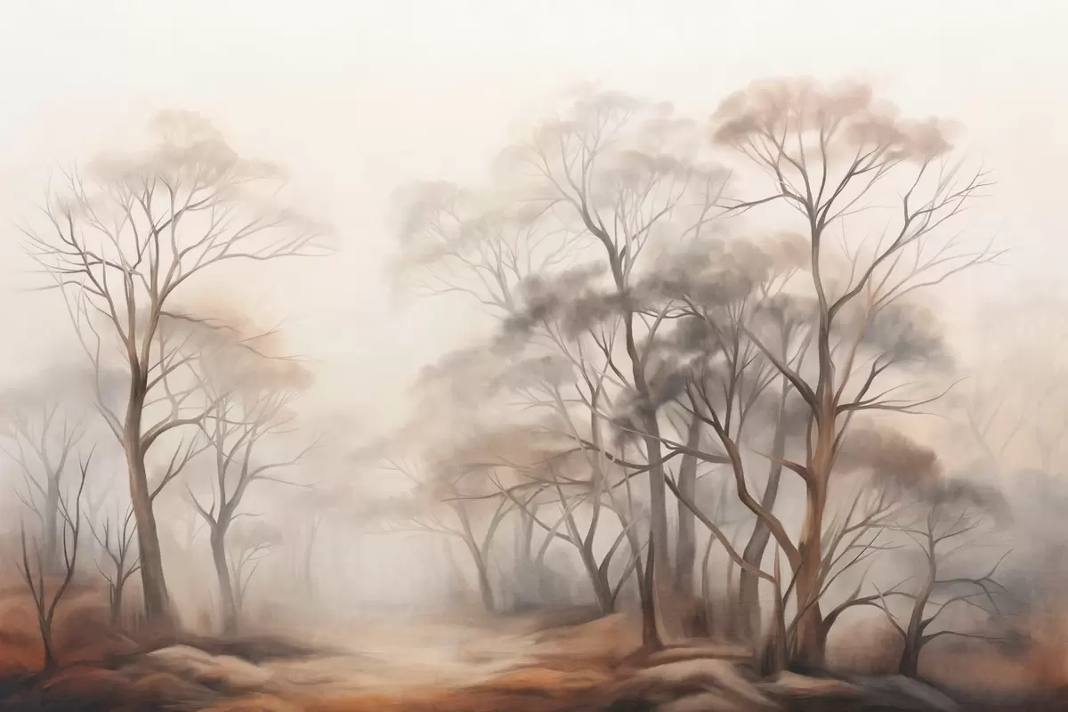 Fototapeten Strukturierte Bäume in einem nebligen Waldgebiet, neblige Landschaft mit gedämpften Farben und sanfter Beleuchtung Nr. w09609