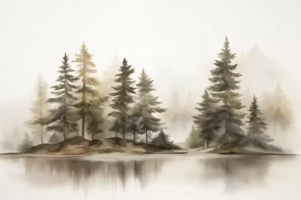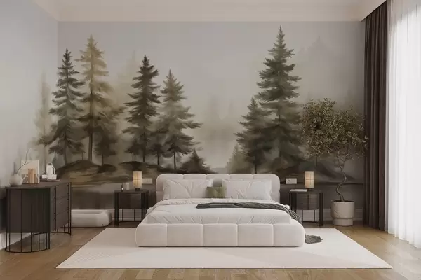 Fototapeten Ein strukturierter, nebliger Wald mit hohen Kiefern, gemalt in Imitationstechnik Nr. w09610