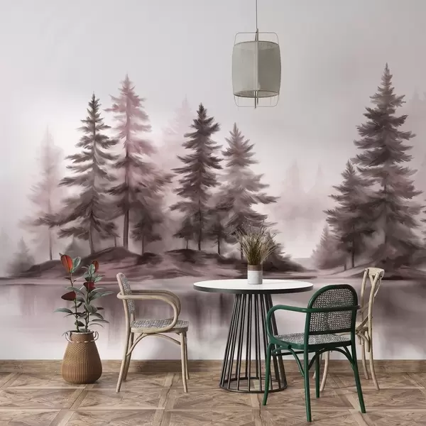 Fototapeten Ein strukturierter, nebliger Wald mit hohen Kiefern, gemalt in Imitationstechnik Nr. w09610v1