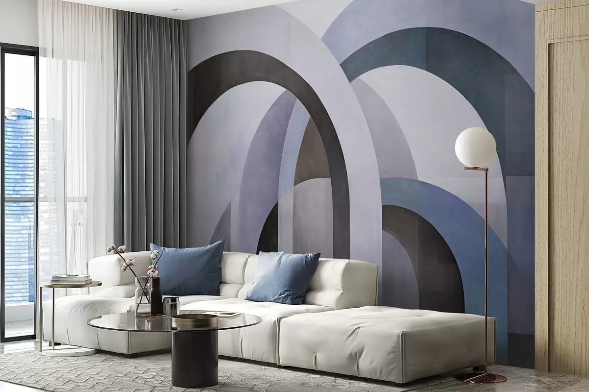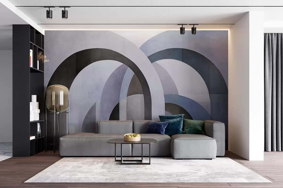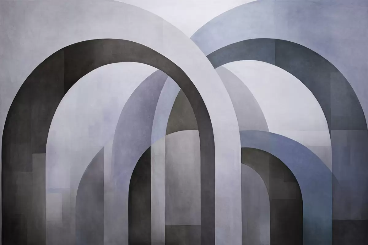 Fototapeten Abstrakte, strukturierte geometrische Bögen in Blau-, Schwarz- und Grautönen, ein vielschichtiges modernes architektonisches Design Nr. w09611v1