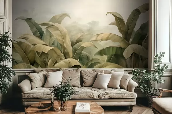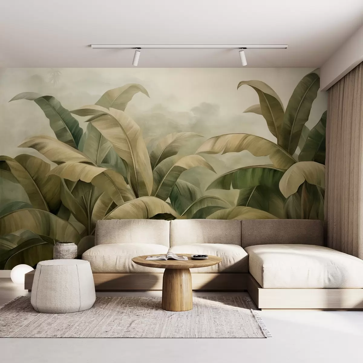 Fototapeten Strukturierte, dichte Dschungellandschaft mit großen Bananenblättern in gedeckten Grün- und Beigetönen Nr. w09613