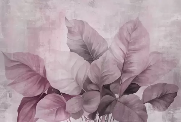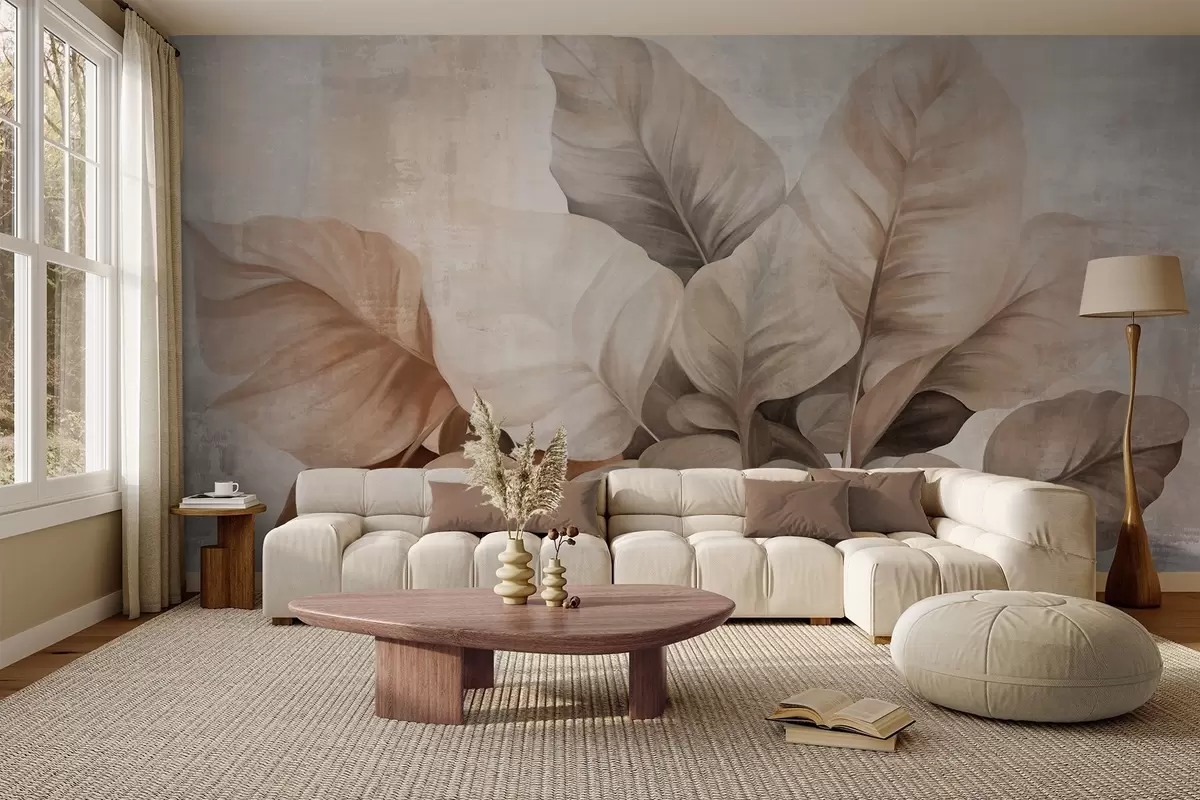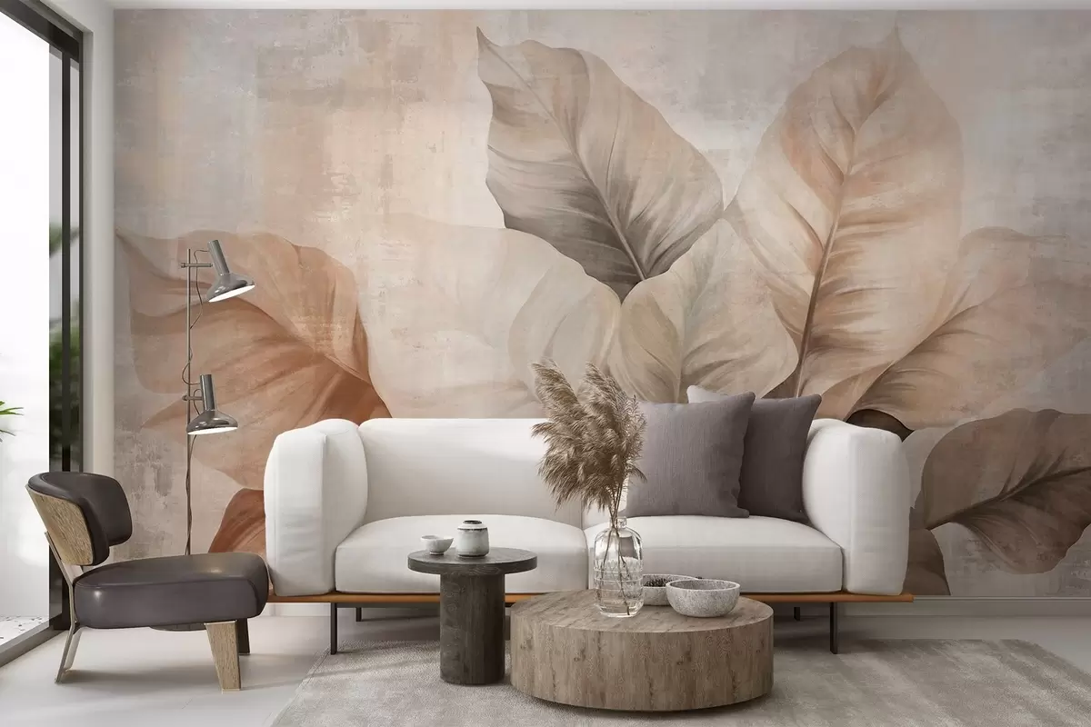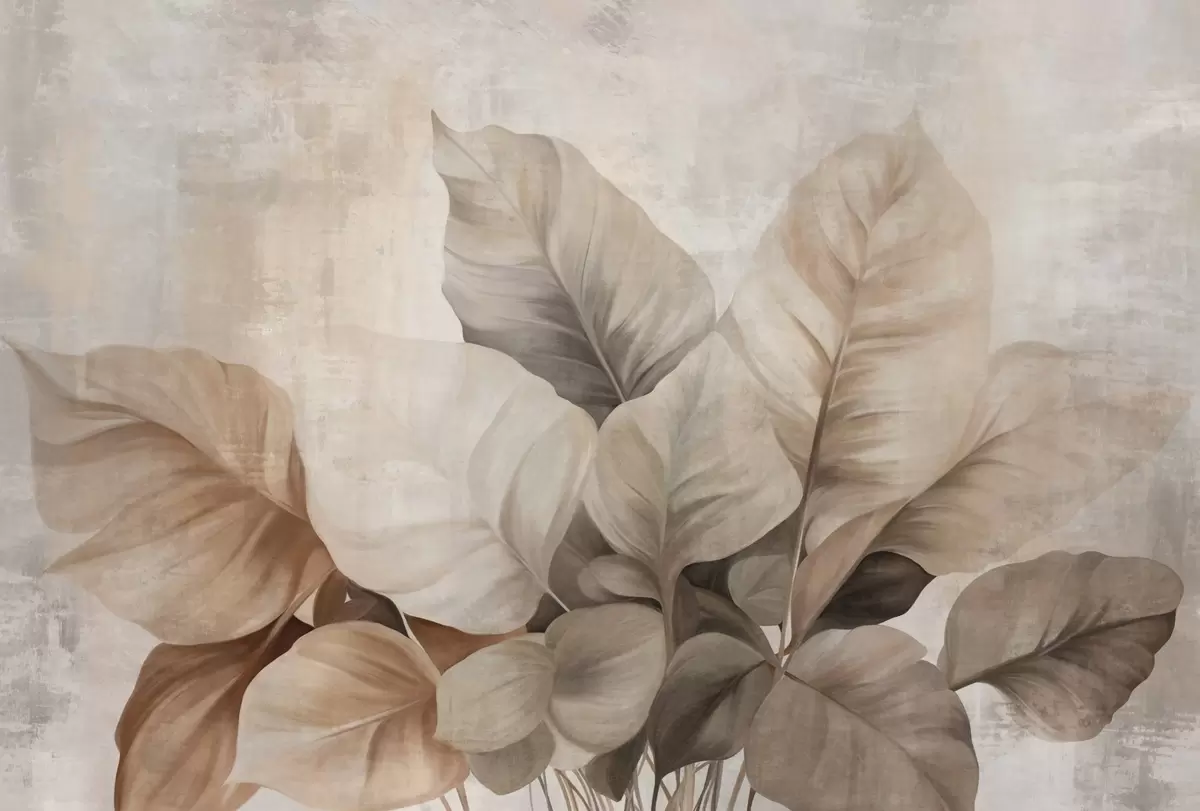 Fototapete Strukturierte Malerei, die große, hellbraune Blätter vor einem neutralen Hintergrund mit subtilen Pinselstrichen imitiert. w09614