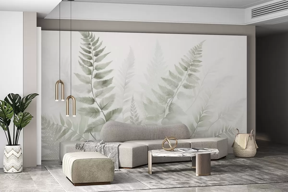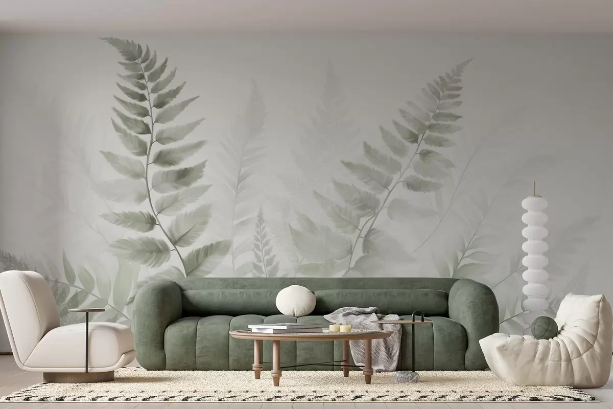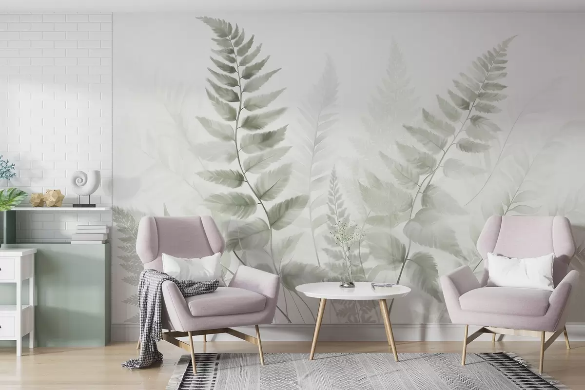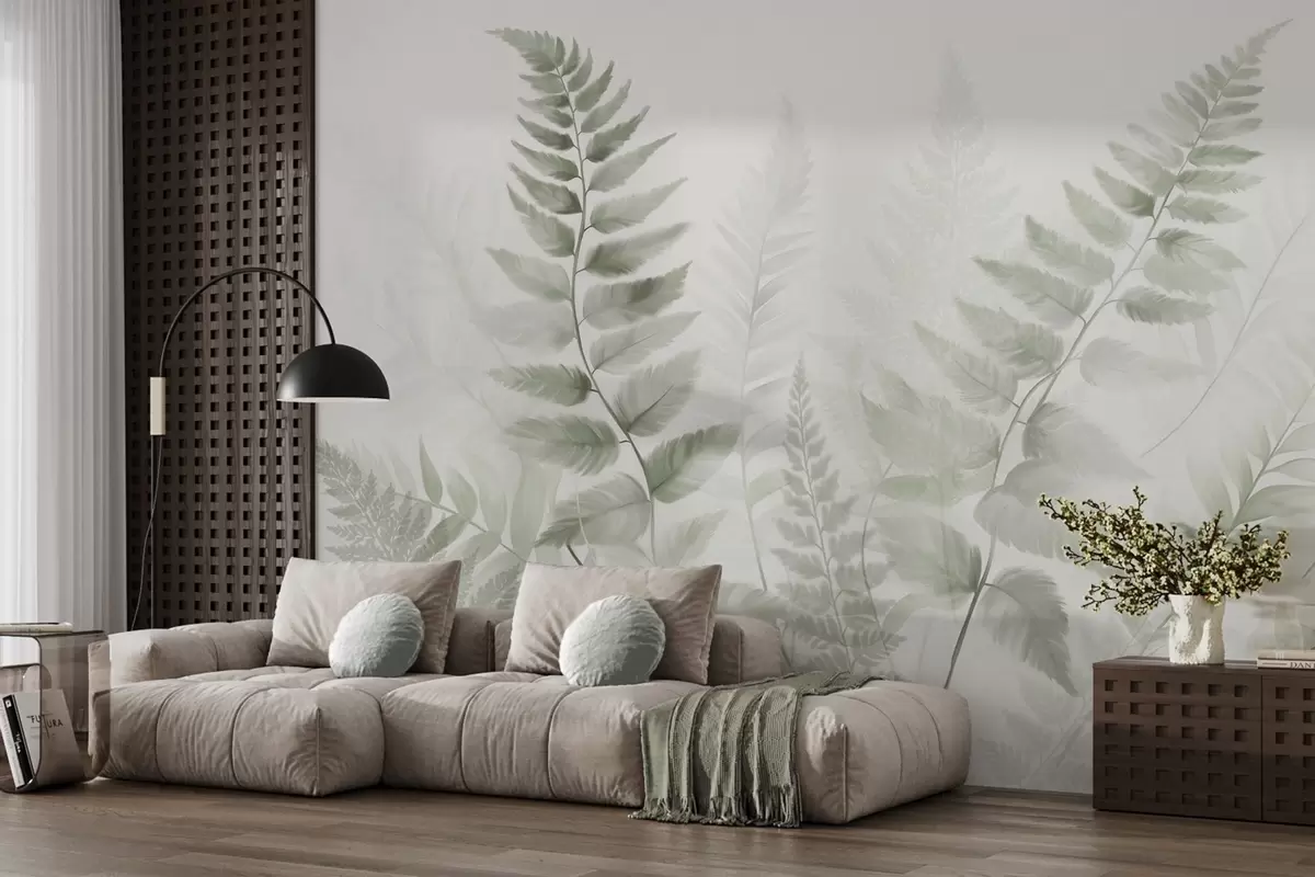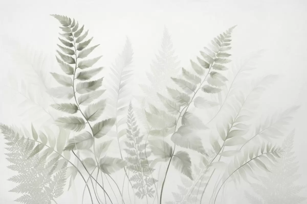 Fototapeten Strukturierte getrocknete Farnwedel in verschiedenen Grüntönen, mit einem weichen, hellen Hintergrund im Aquarellstil Nr. w09615v1