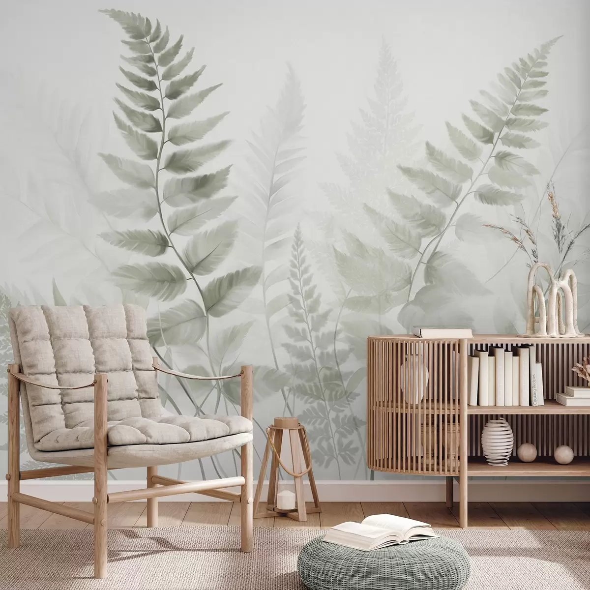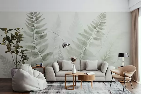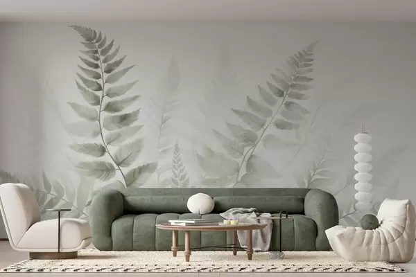 Fototapeten Strukturierte getrocknete Farnwedel in verschiedenen Grüntönen, mit einem weichen, hellen Hintergrund im Aquarellstil Nr. w09615v1