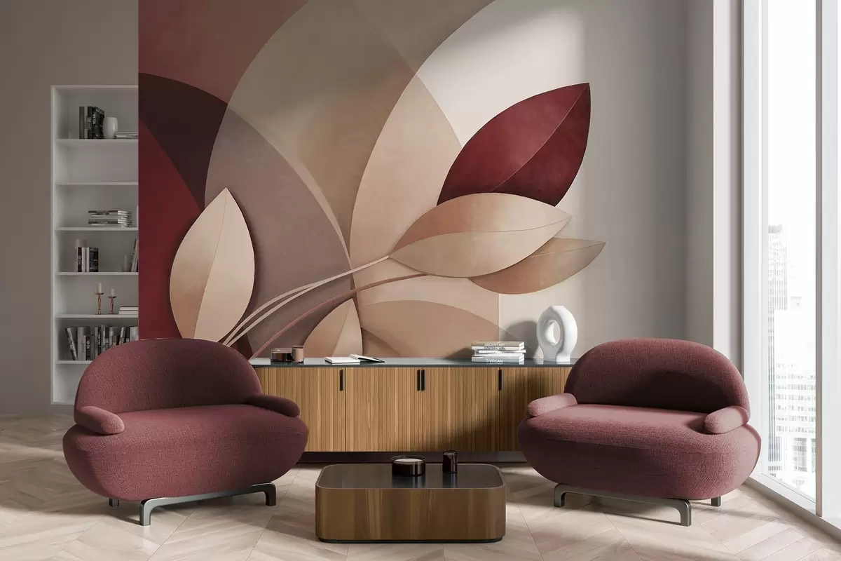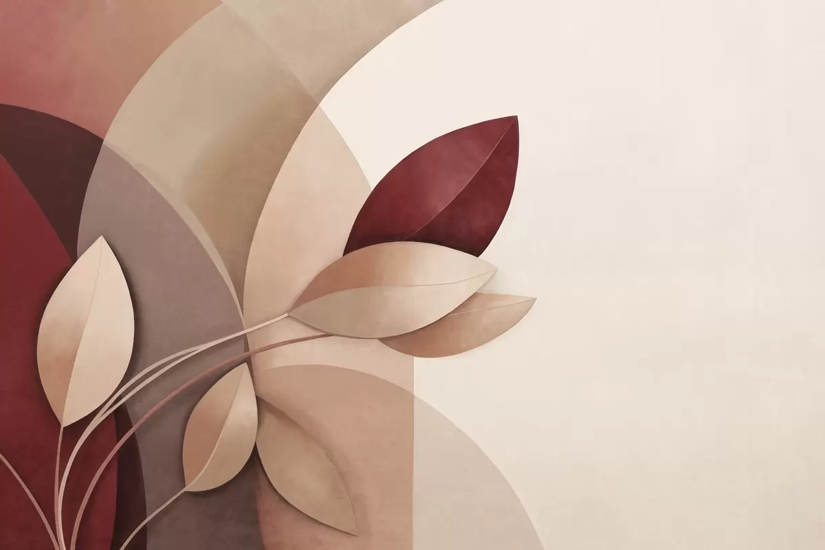 Fototapeten Abstrakter, strukturierter Ast mit Blättern in Braun-, Beige- und Rottönen vor einem Hintergrund aus abstrakten Formen Nr. w09618