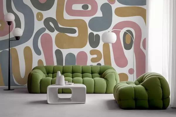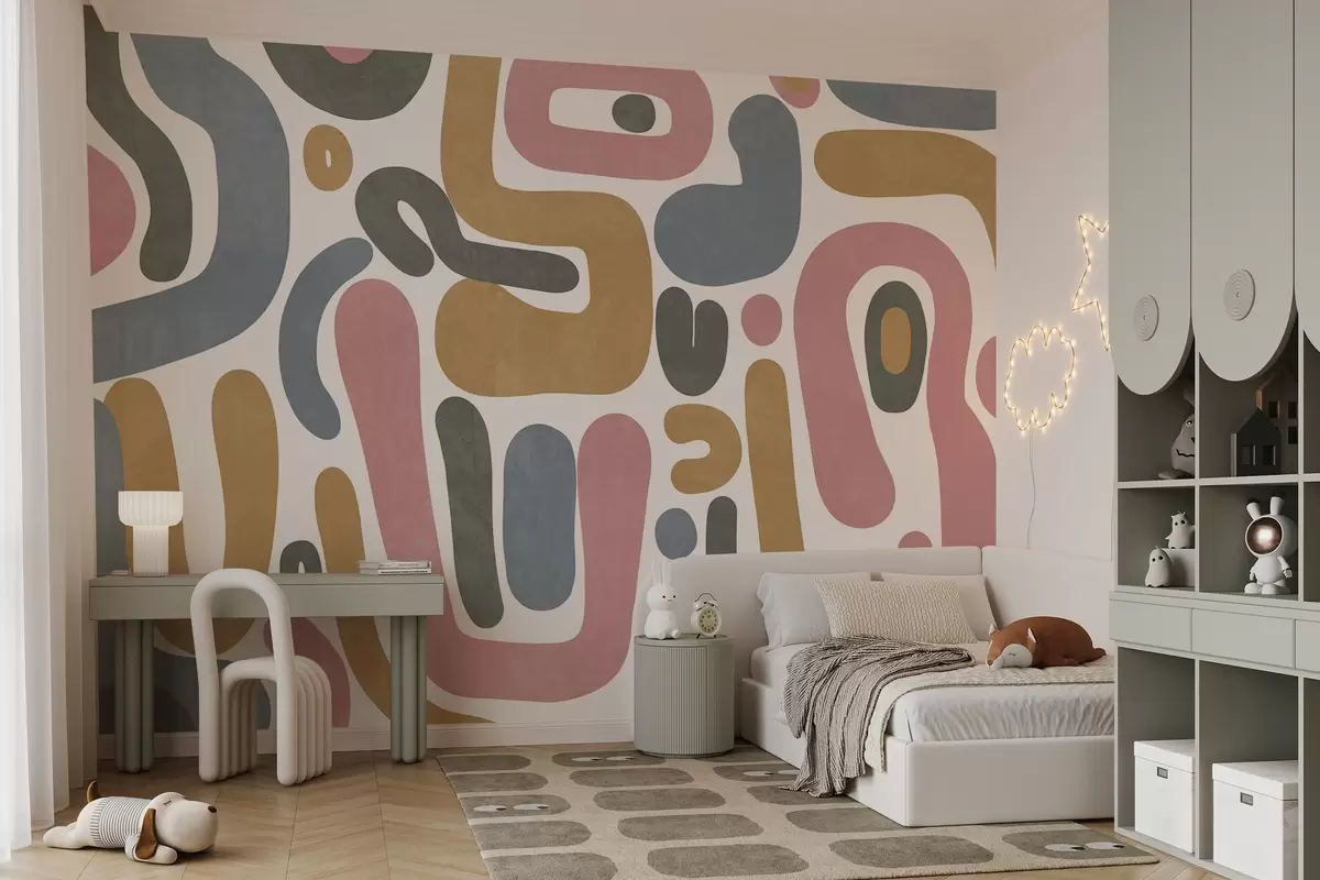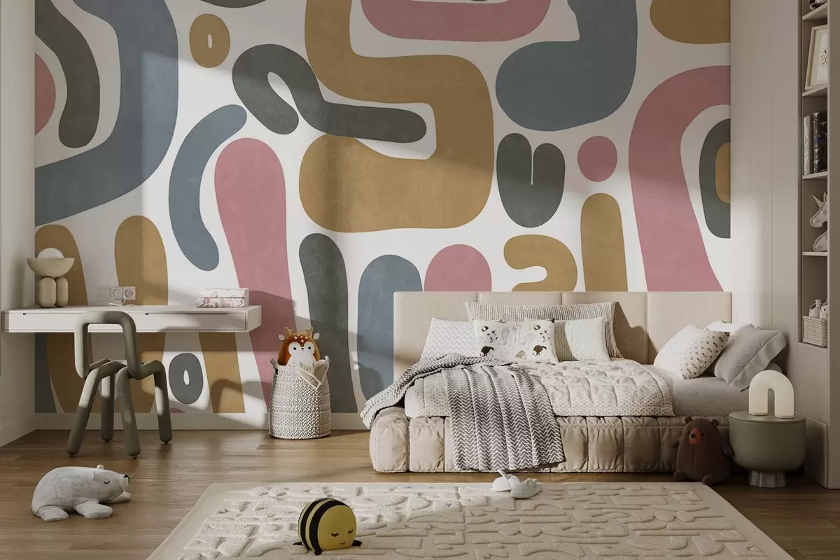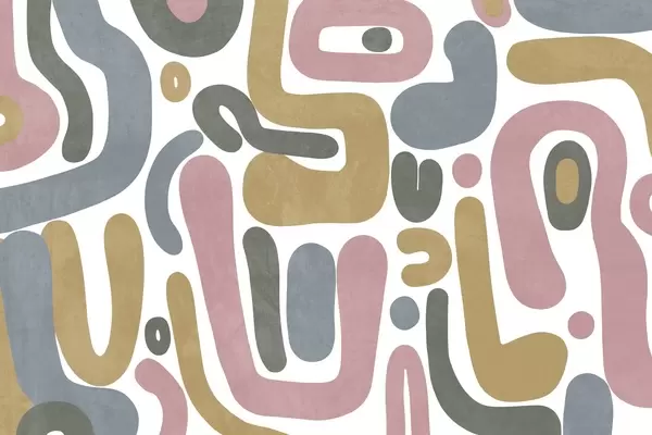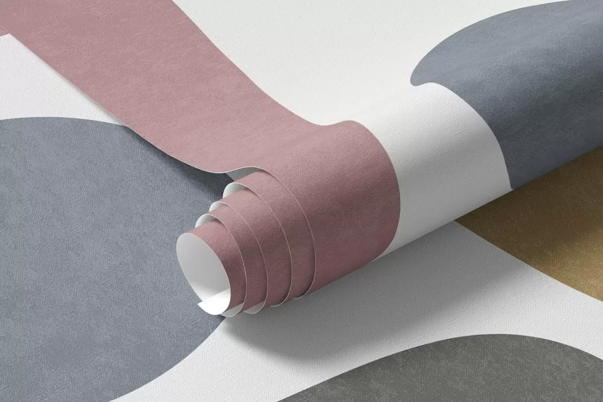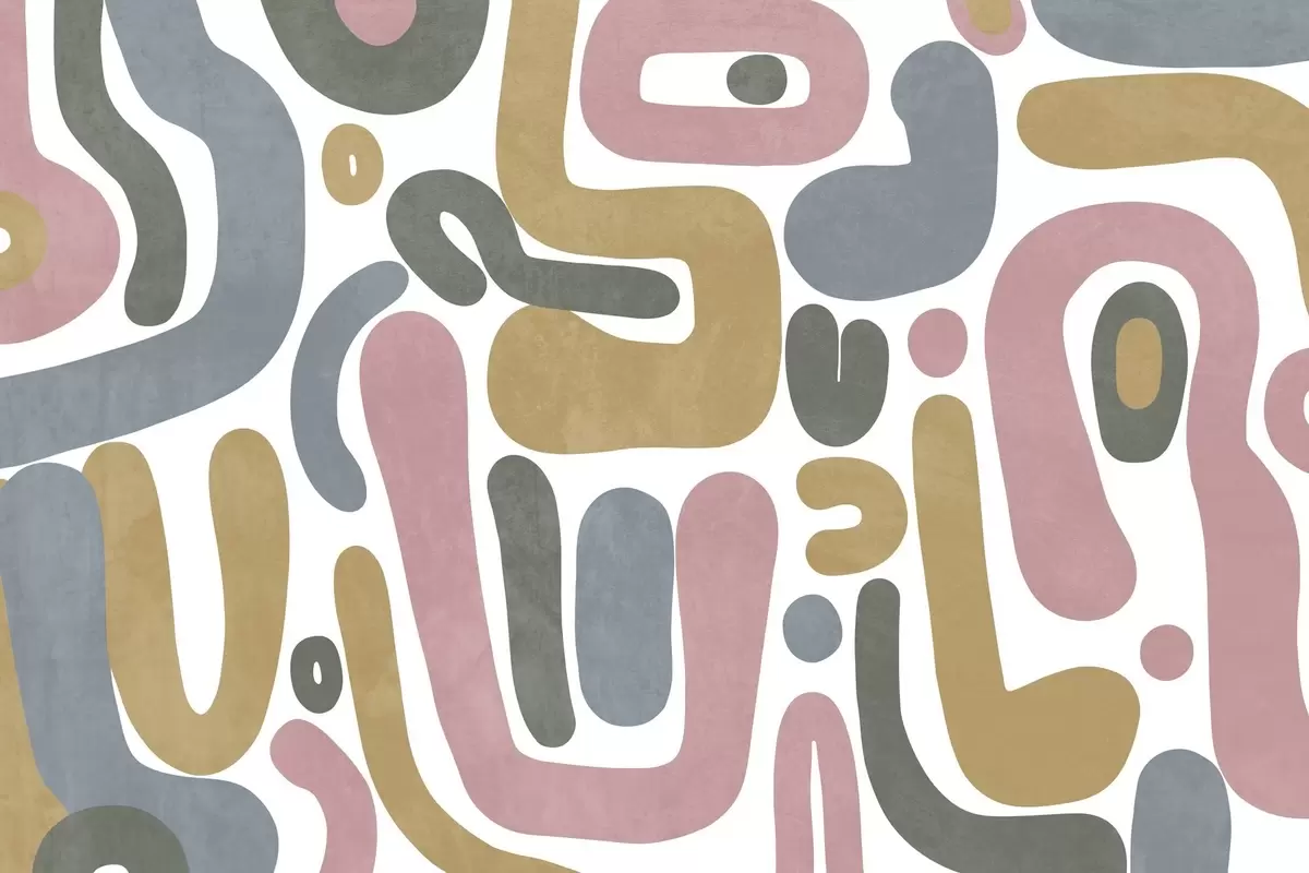 Fototapeten Abstrakte, strukturierte Formen in Pastellrosa, gedecktem Blau, Senfgelb und Grau auf weißem Hintergrund – moderne Kunst Nr. w09620