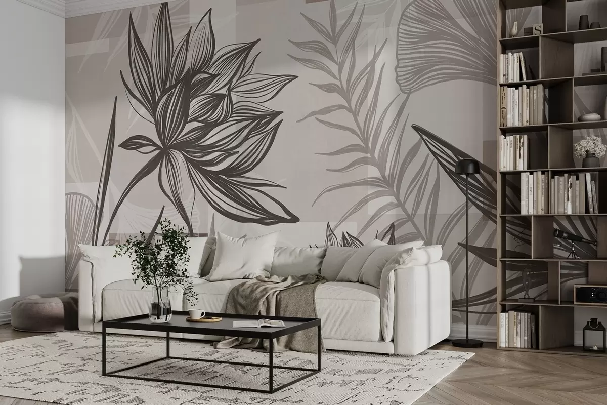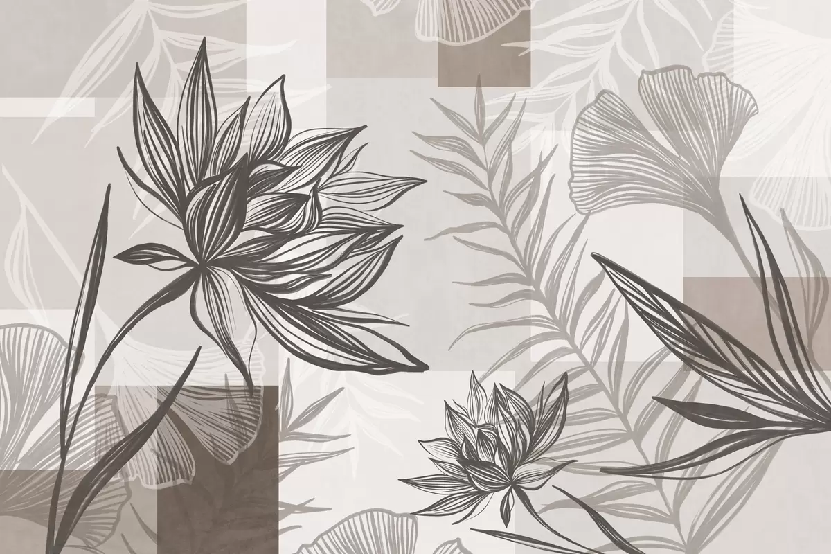Fototapeten Stilisierte Blumen und Blätter in Braun- und Beigetönen mit geometrischem Hintergrund, Strichzeichnung Nr. w09629