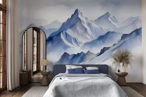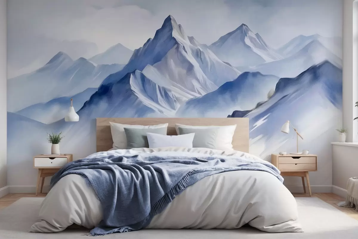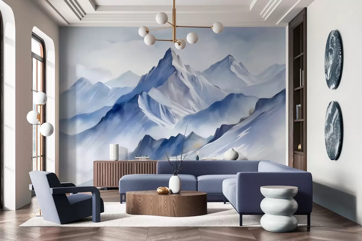 Fototapeten Strukturierte schneebedeckte Berge mit einem sanften Aquarelleffekt und einer Farbpalette aus Blau- und Weißtönen Nr. w09630
