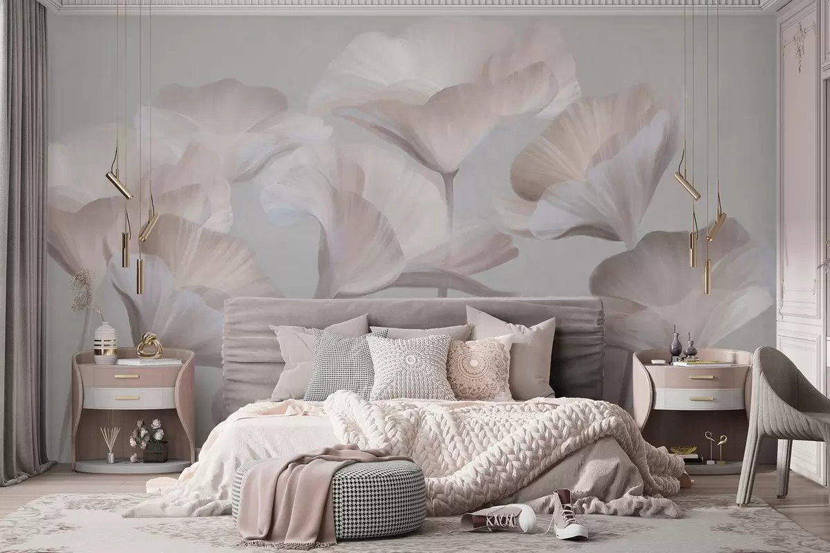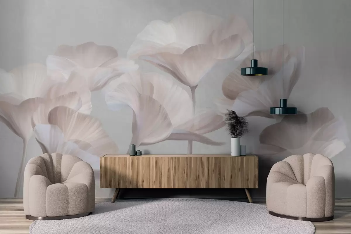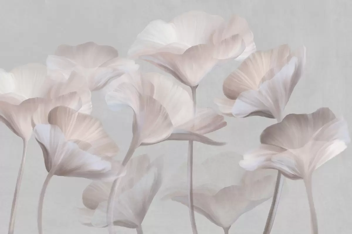 Fototapeten Blasspfirsichfarbene, strukturierte, durchscheinende Lotusblüten mit zarten Blütenblättern vor einem gedämpften grauen Hintergrund Nr. w09640