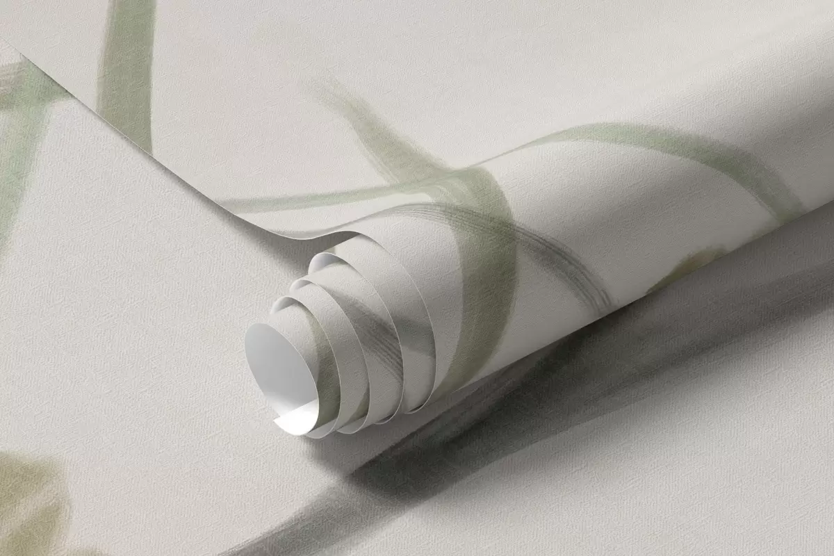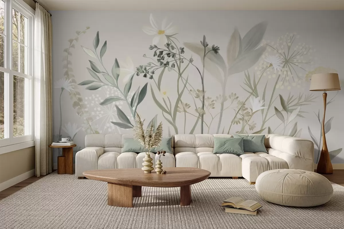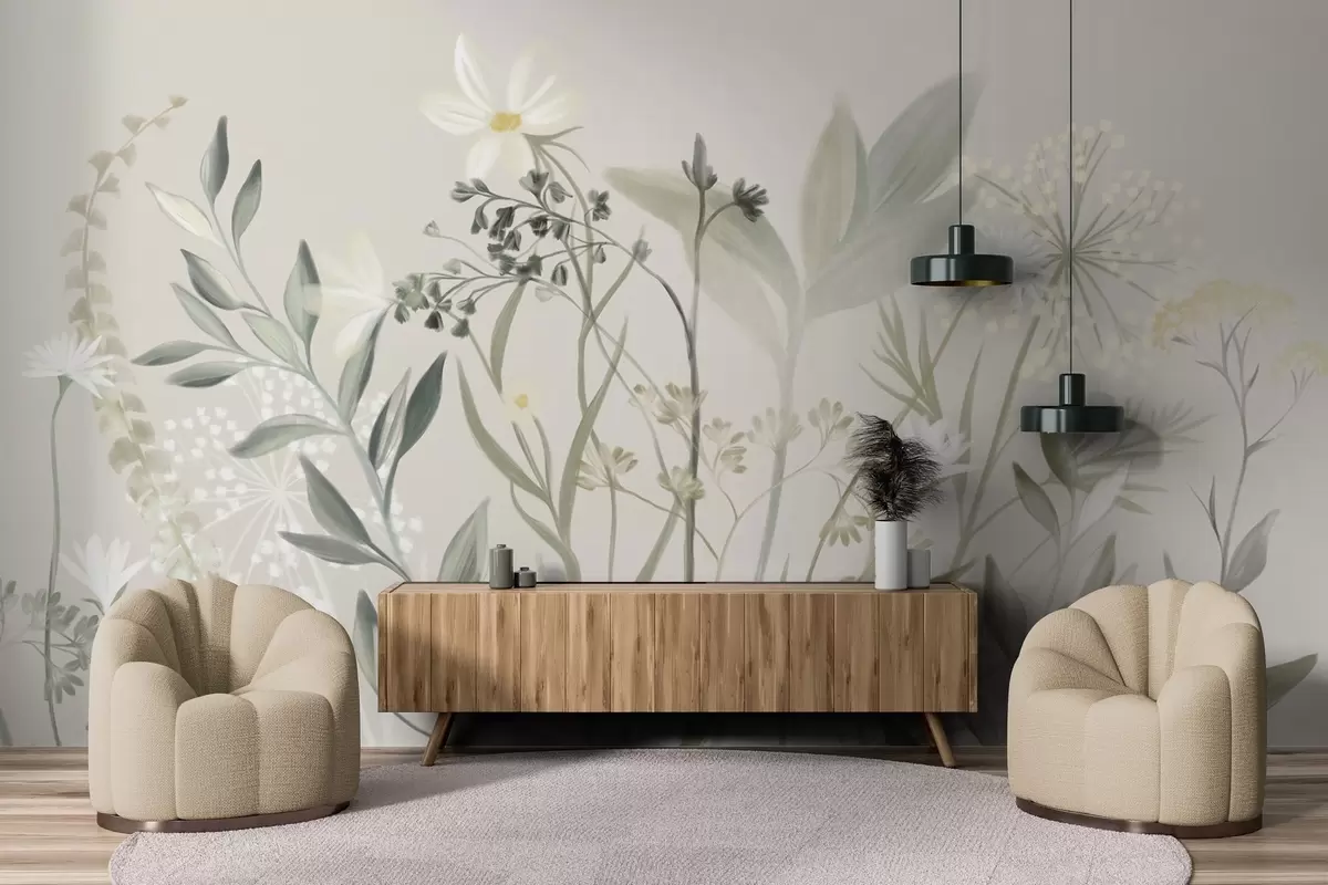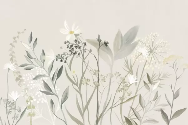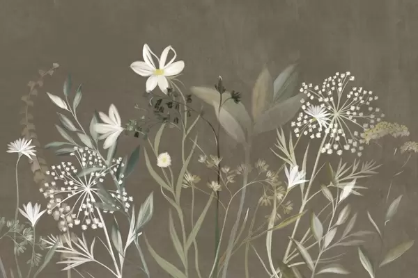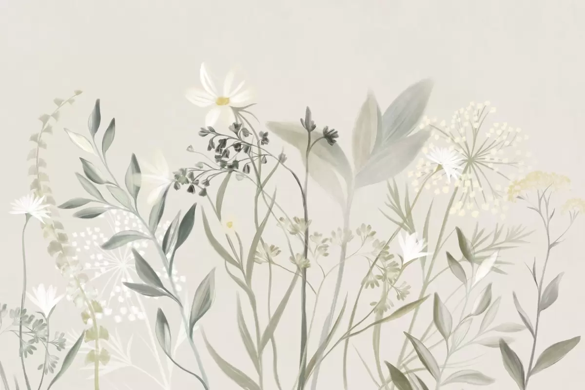 Fototapeten Zarte Wildblumen und Blätter in gedeckten Grün- und Cremetönen vor einem sanften beigen Hintergrund Nr. w09641