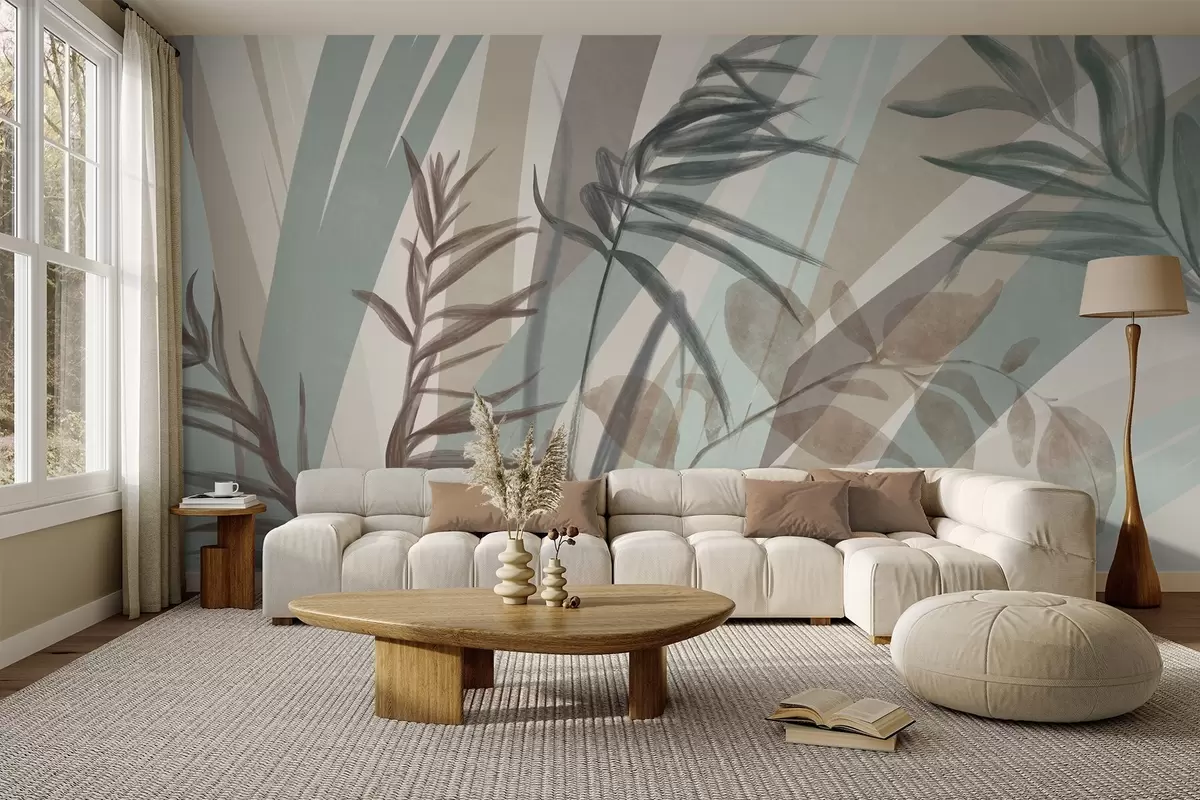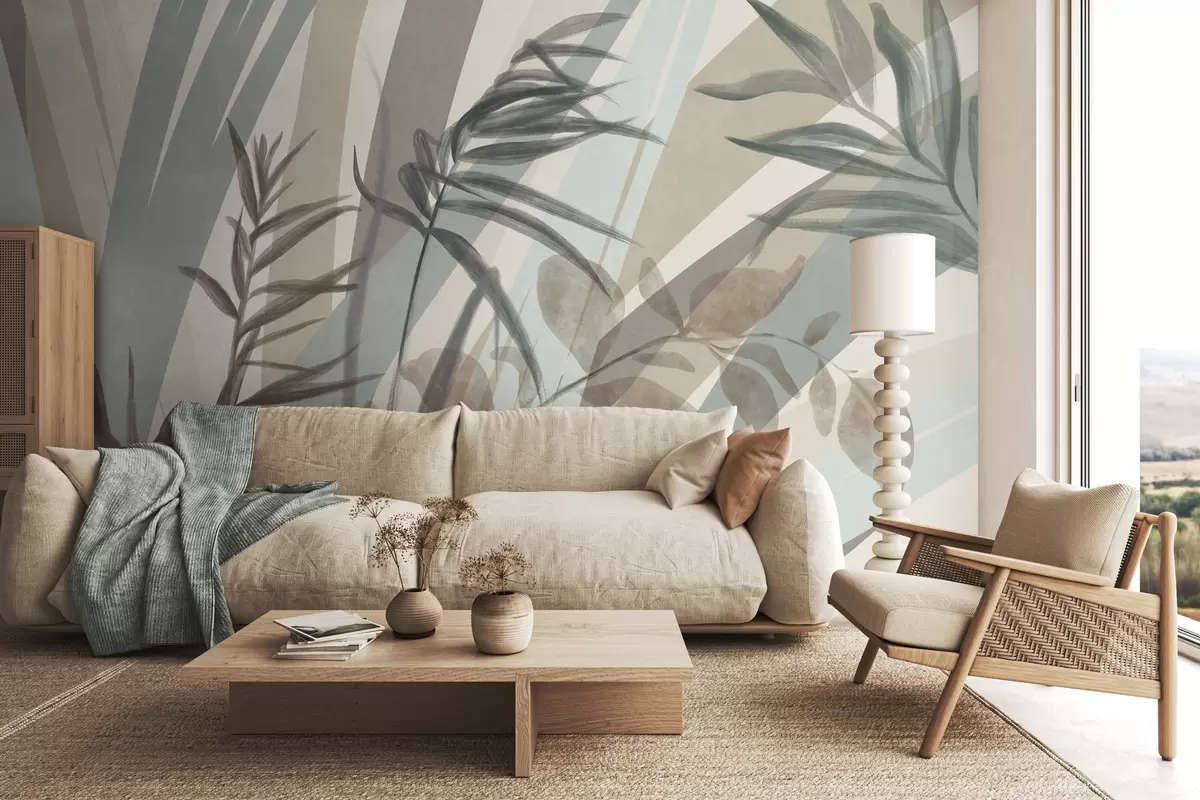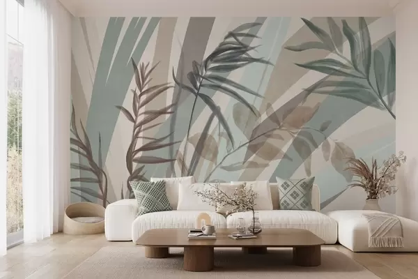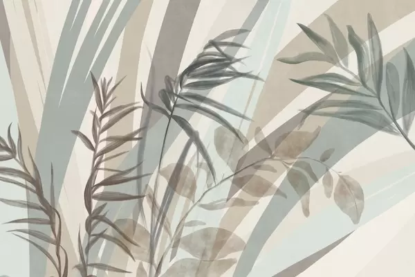 Fototapeten Hohes, strukturiertes Gras und Blätter in gedeckten Erdtönen, mit abstrakten Linien im Hintergrund, die einen organischen Druck ergeben. Nr. w09643