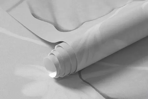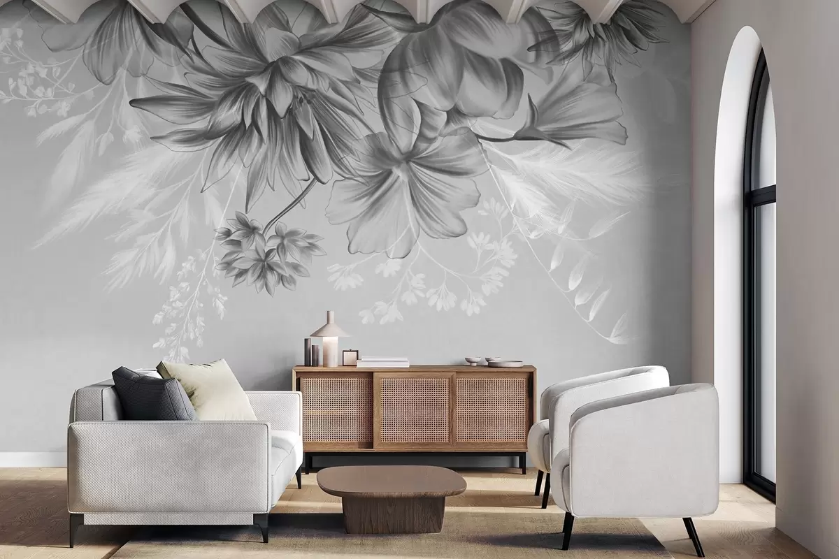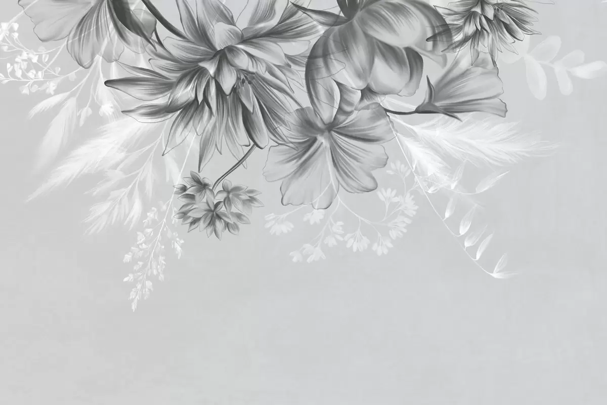 Fototapeten Strukturierte Blumen und Farne in Dunkelgrau- und Weißtönen vor einem gedeckten grauen Hintergrund im Zeichenstil Nr. w09644v1