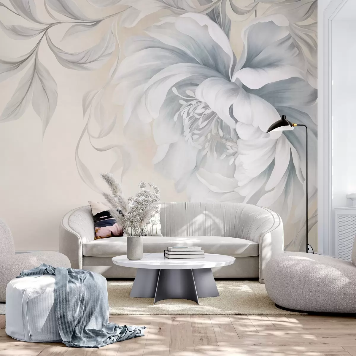 Fototapeten Große, strukturierte Pfingstrose mit zarten Blütenblättern und grauen Blättern, in sanftem Stil gemalt Nr. w09647