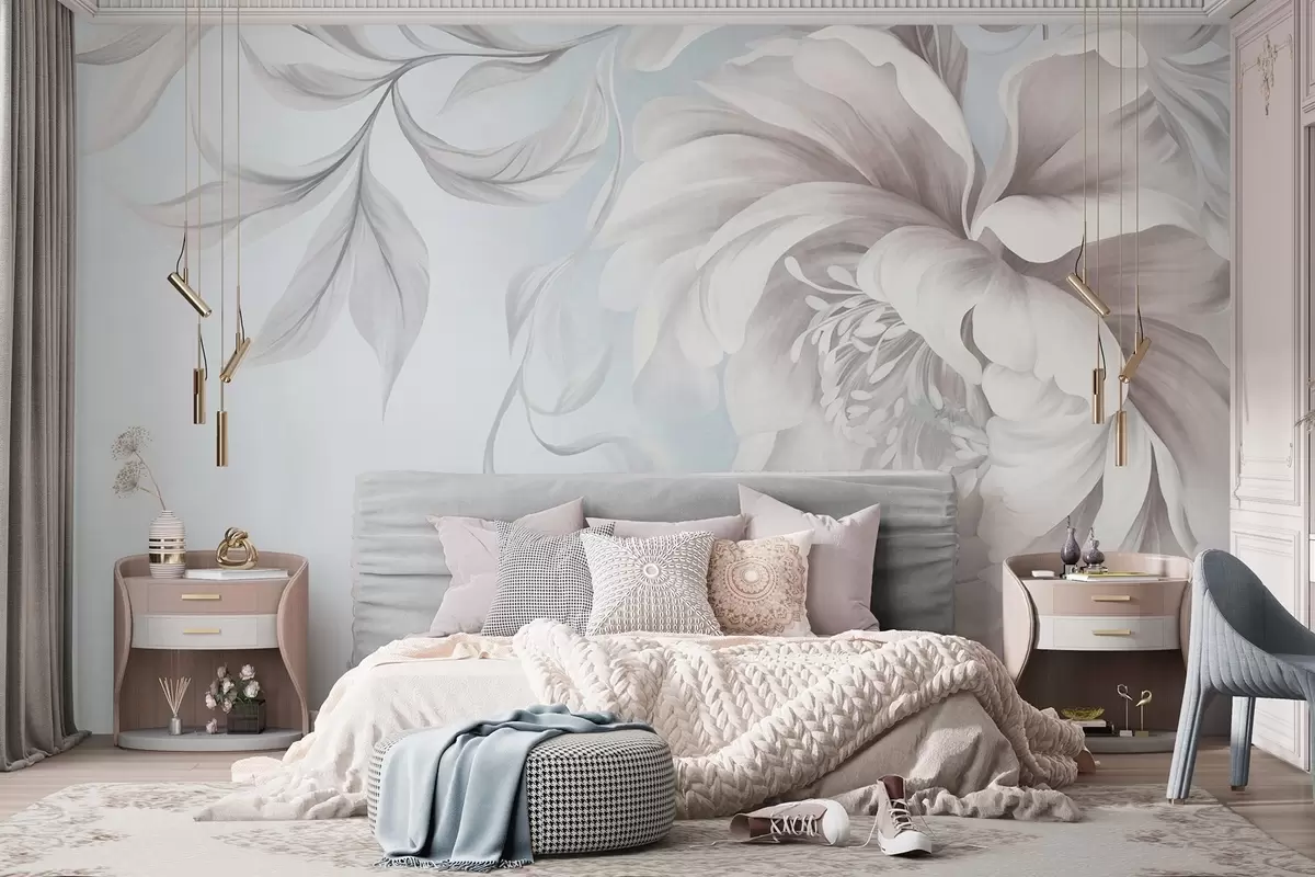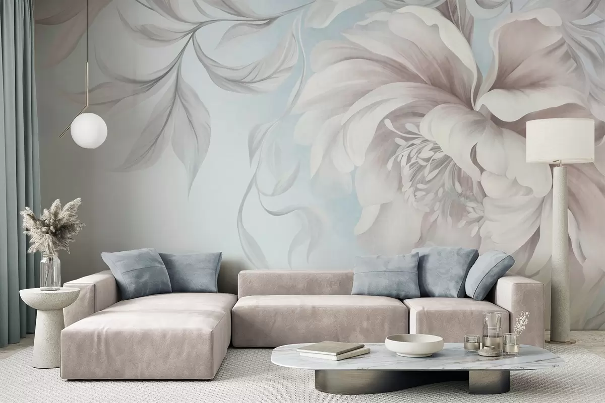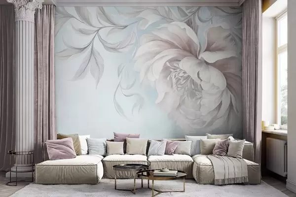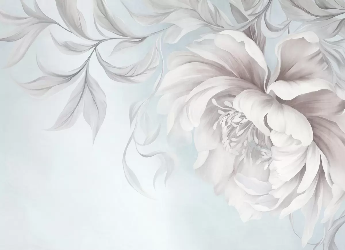 Fototapeten Große, strukturierte Pfingstrose mit zarten Blütenblättern und grauen Blättern, in sanftem Stil gemalt Nr. w09647v1