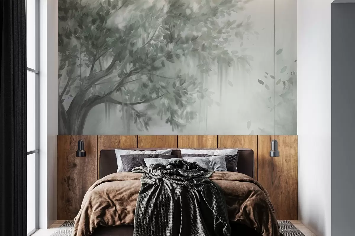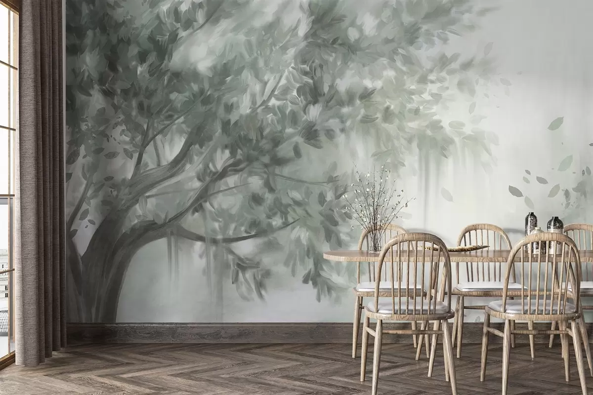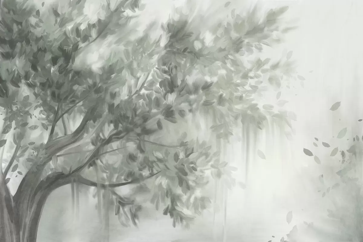 Fototapeten Strukturierter Baum mit grünen Blättern und Zweigen, mit einem weichen, verschwommenen Hintergrund Nr. w09650v1