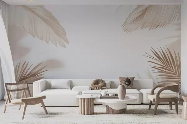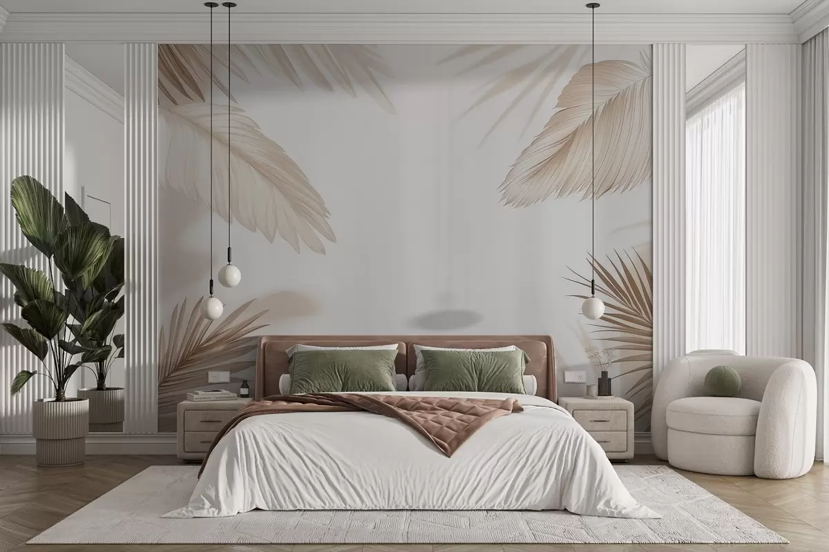 Fototapeten Beiges tropisches Dekor mit Palmenblatt-Silhouetten und sanften Schatten Nr. w09714