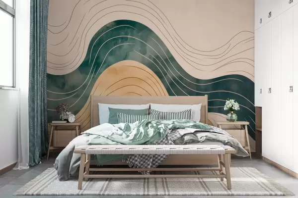 Fototapeten Abstrakte, wellenförmige Linien in natürlichen Sand- und Smaragdtönen Nr. w09732