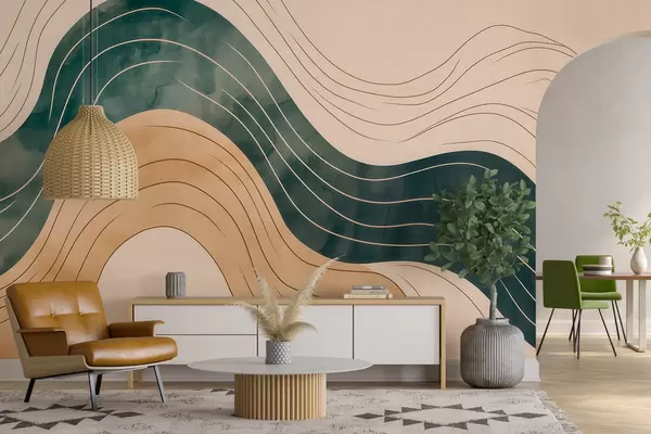 Fototapeten Abstrakte, wellenförmige Linien in natürlichen Sand- und Smaragdtönen Nr. w09732