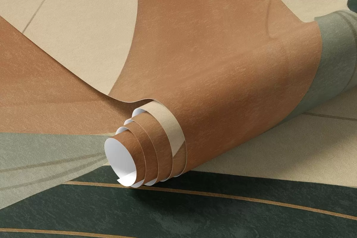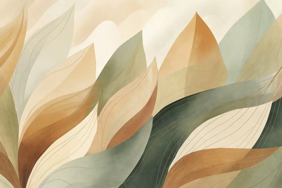 Fototapeten Abstrakte Blätter, gedämpfte Erdtöne in Grün und Orange mit zarten Liniendetails, weiche Aquarelltextur Nr. w09736