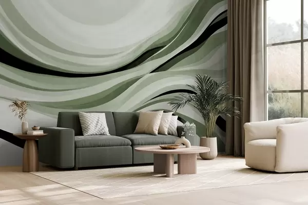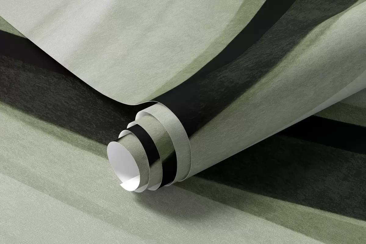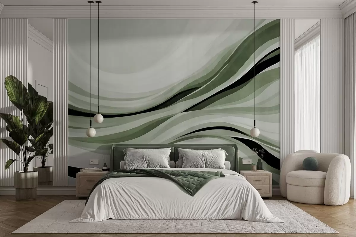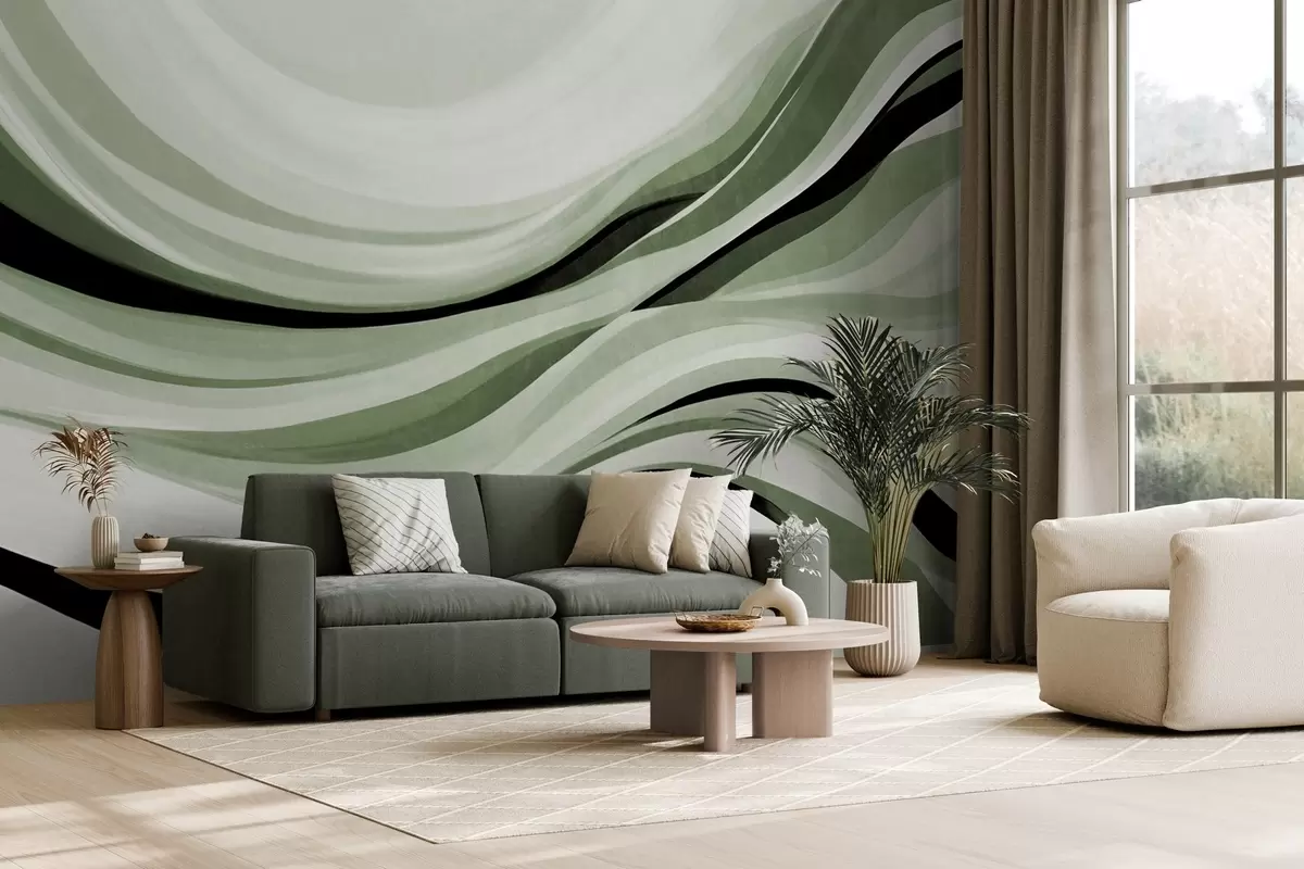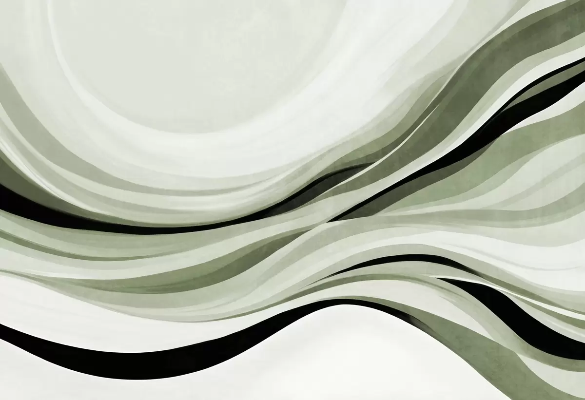 Fototapeten Abstrakte Wellenlinien in Grün- und Schwarztönen vor hellem Hintergrund, strukturierte Kunst Nr. w09748v1