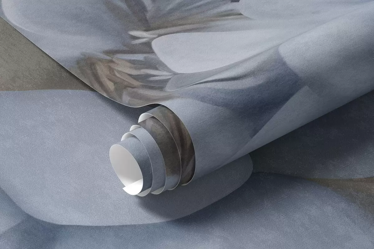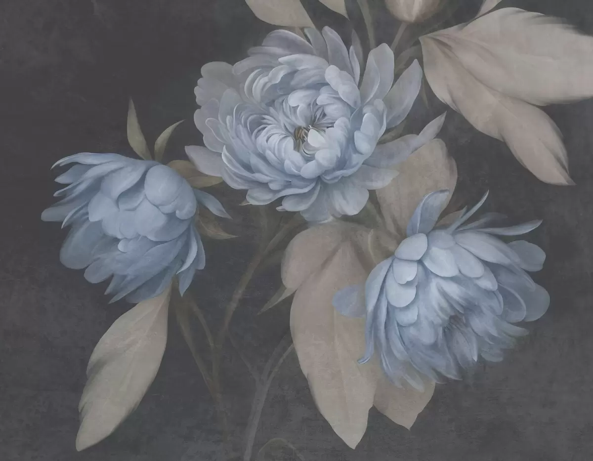 Fototapeten Strukturierte hellblaue Pfingstrosenblüten mit beigen Blättern vor einem dunklen Hintergrund Nr. w09751