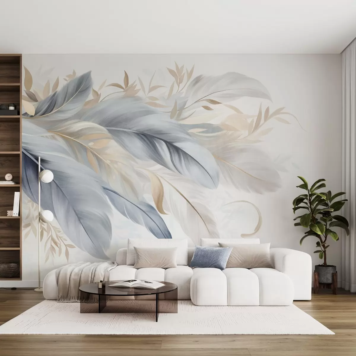Fototapeten Strukturierte pastellfarbene Federn und zarte Blätter vor einem hellen Hintergrund Nr. w09763