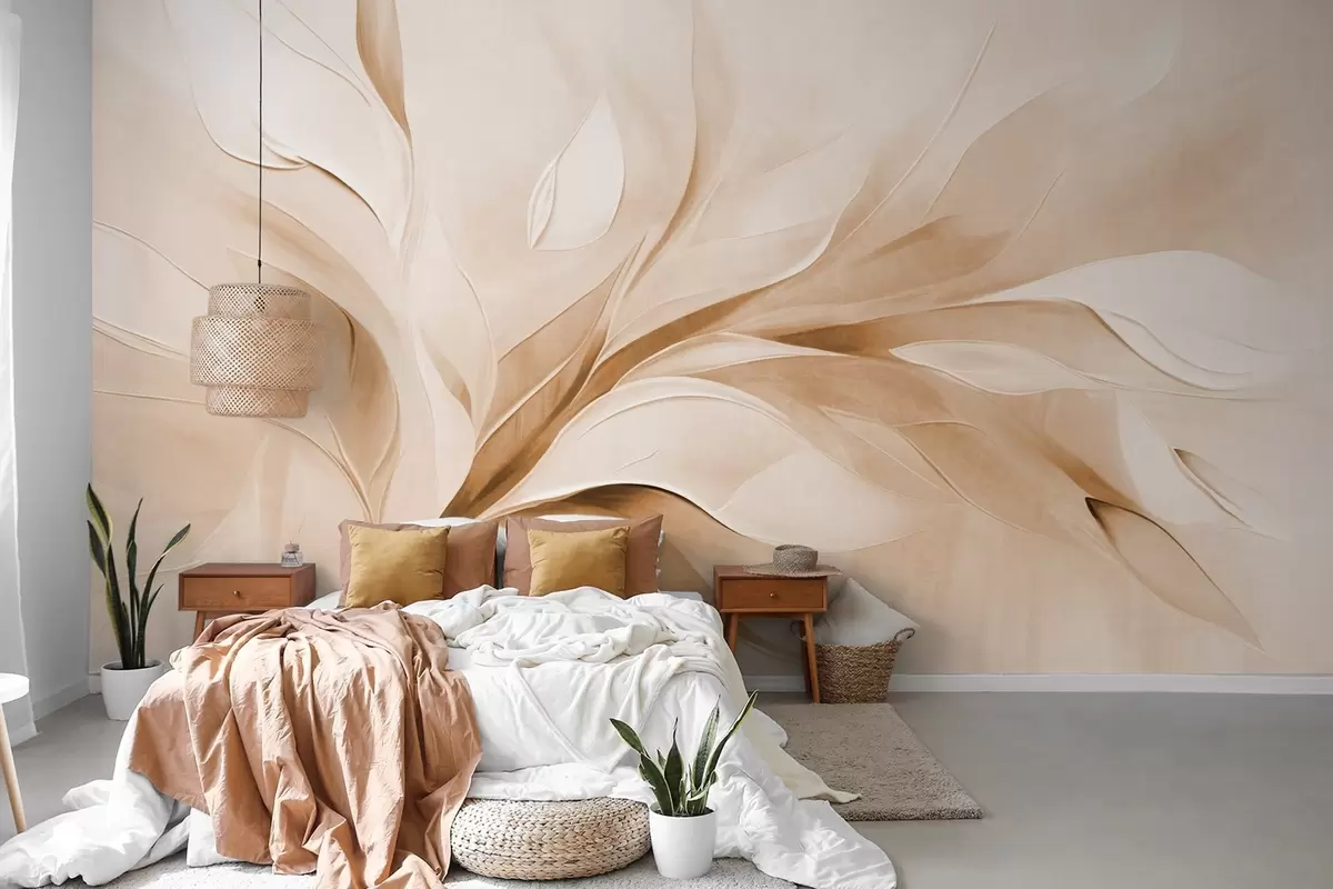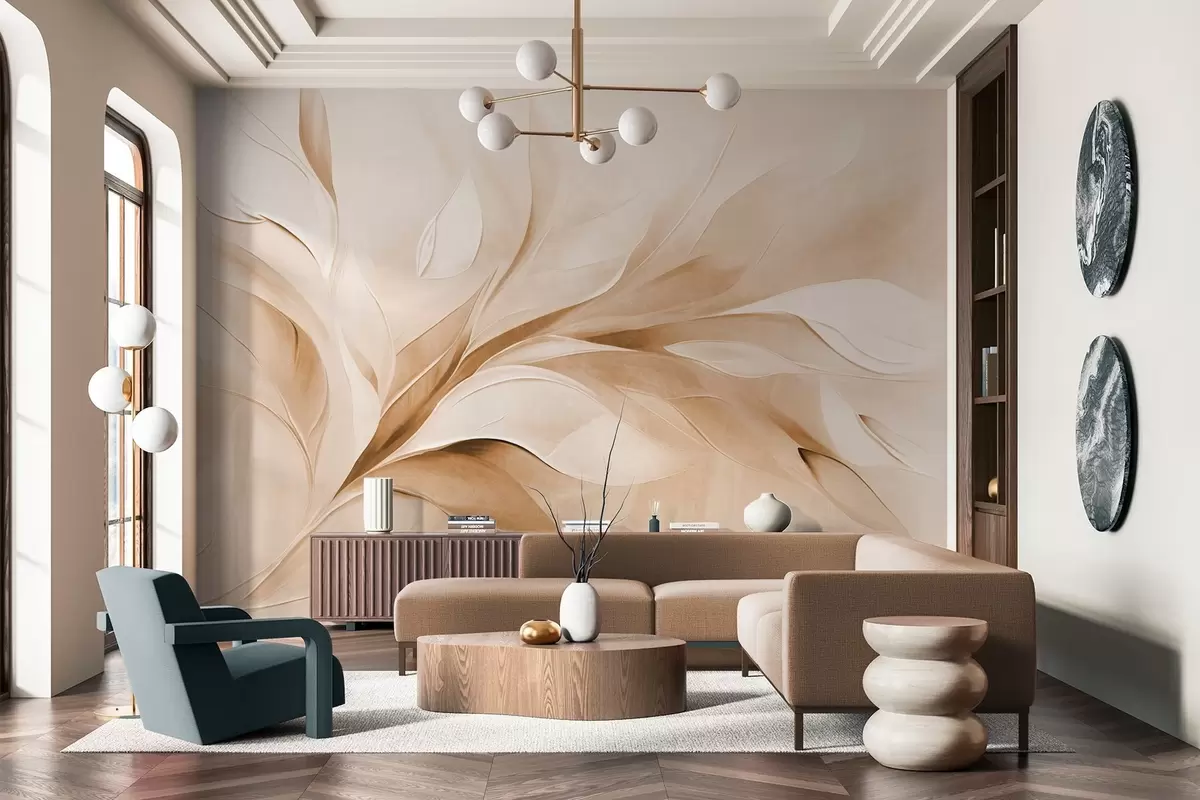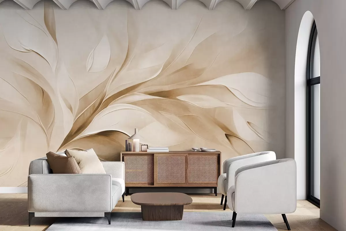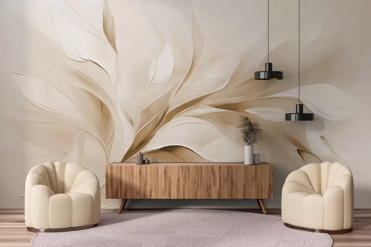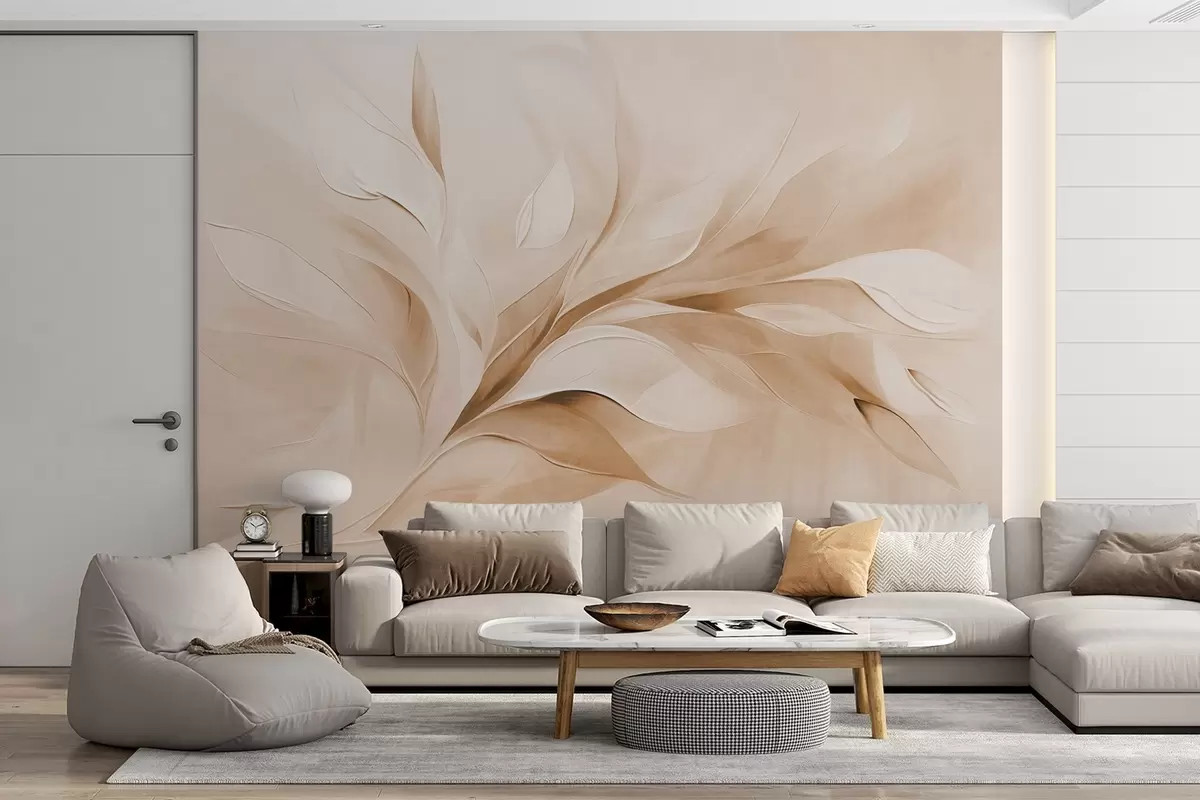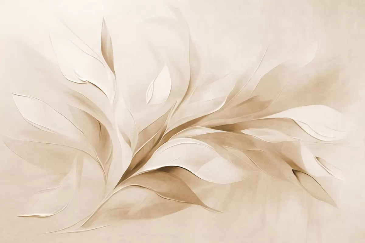 Fototapeten Abstrakter, strukturierter Malstil mit fließenden Blättern in Beige und Weiß Nr. w09765v1
