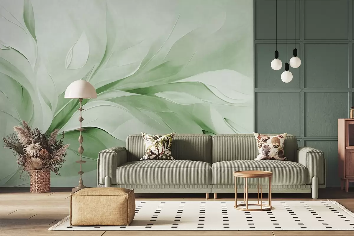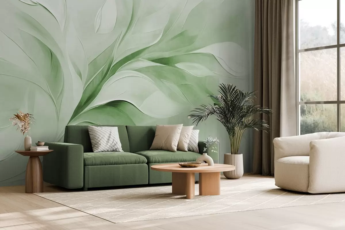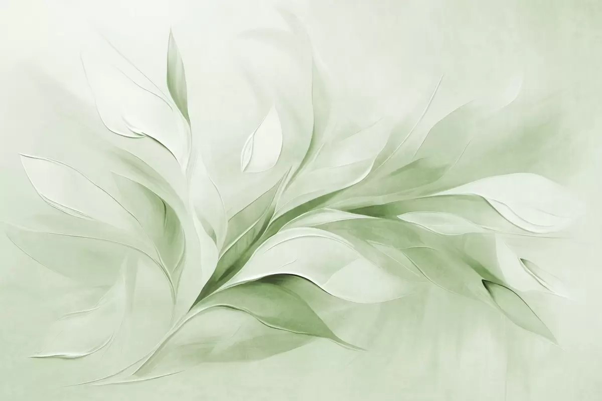 Fototapeten Abstrakter, strukturierter Malstil mit fließenden Blättern in Grün und Weiß Nr. w09765v2