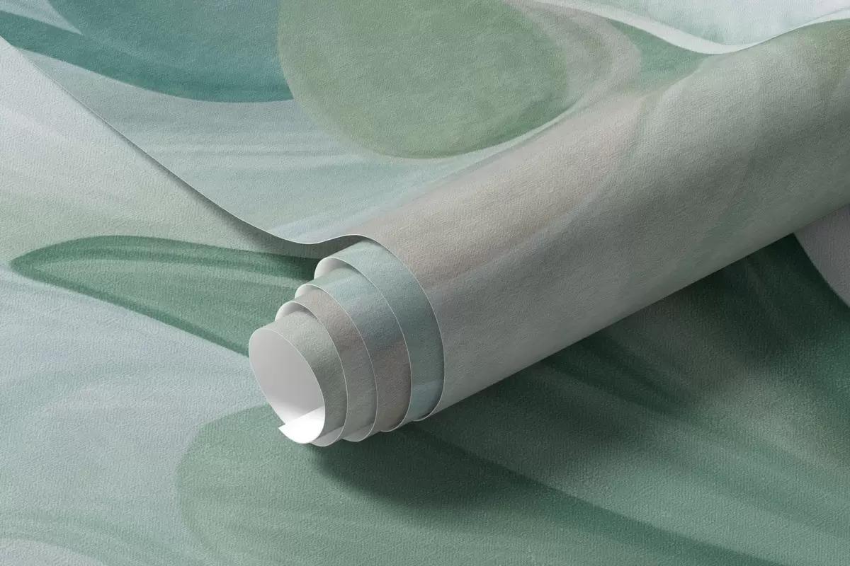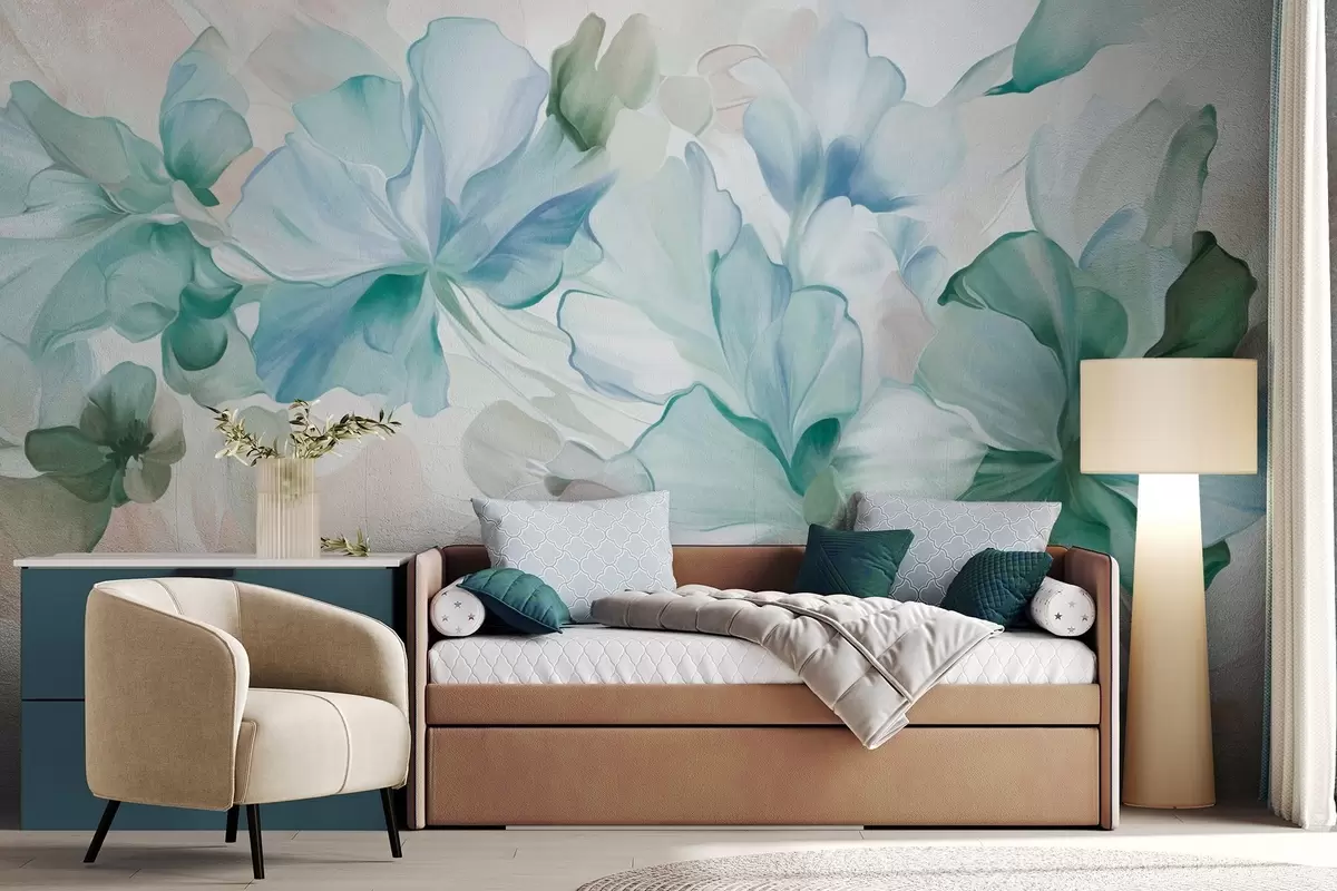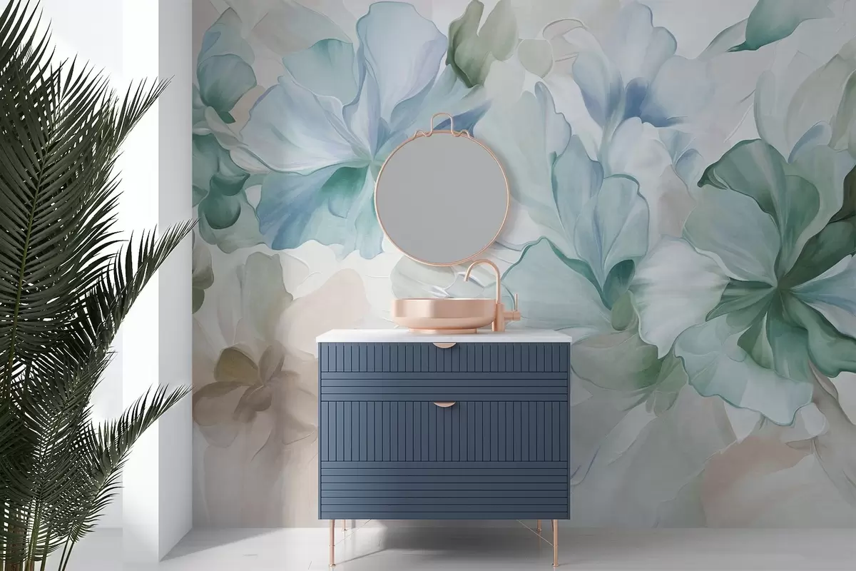 Fototapeten Abstrakte Fantasieblumen in Grün-, Blau- und Beigetönen im Malstil, strukturierte Kunst Nr. w09767v1