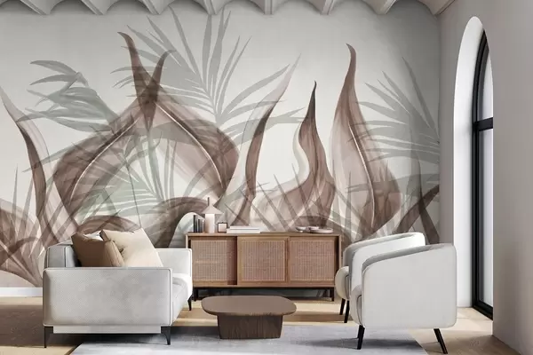 Fototapeten Tropische Blätter in Braun- und Grüntönen vor weißem Hintergrund, strukturierter Aquarellstil Nr. w09772
