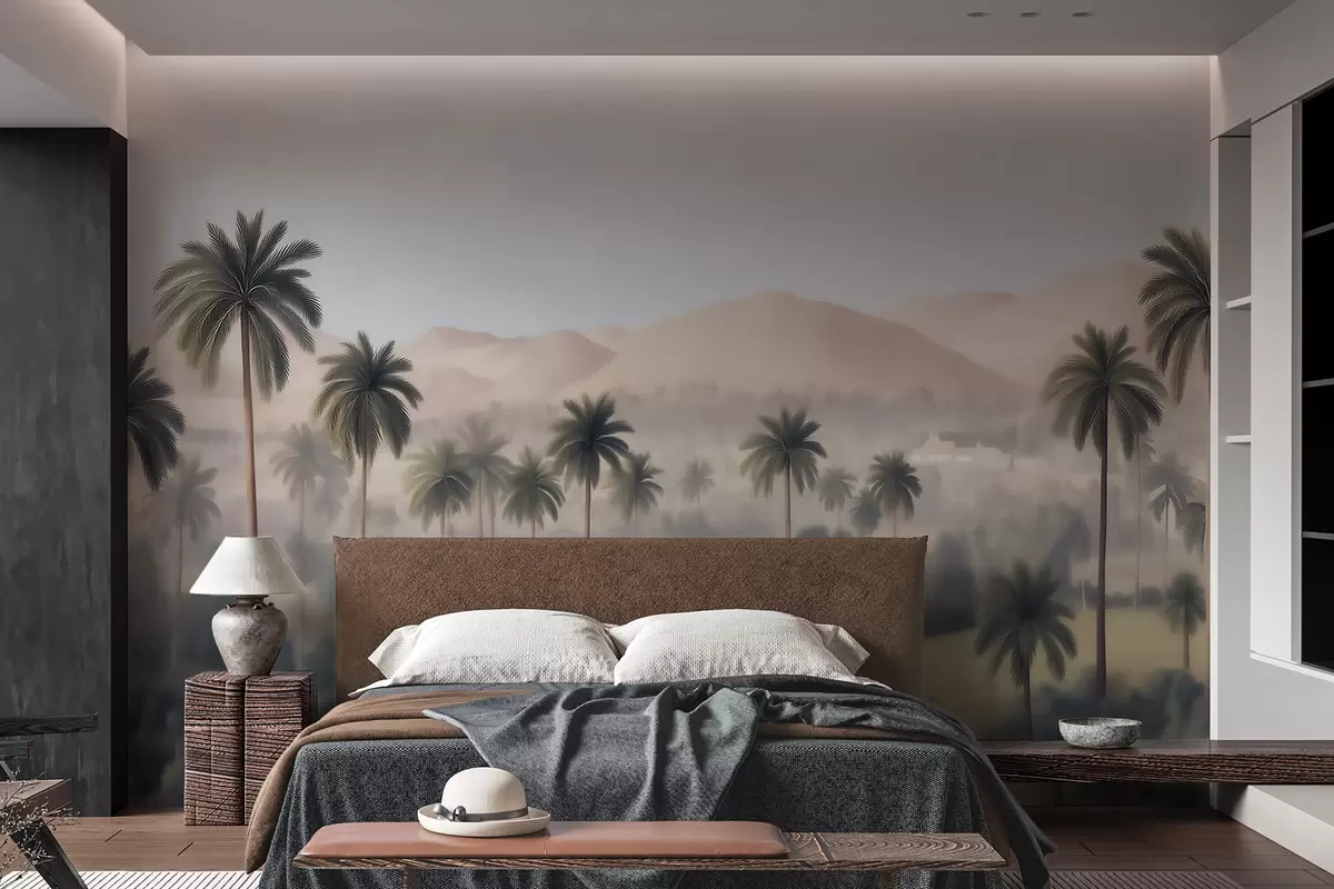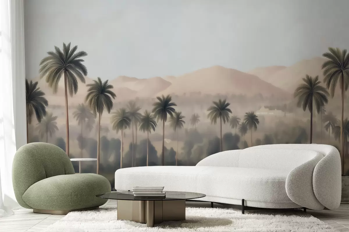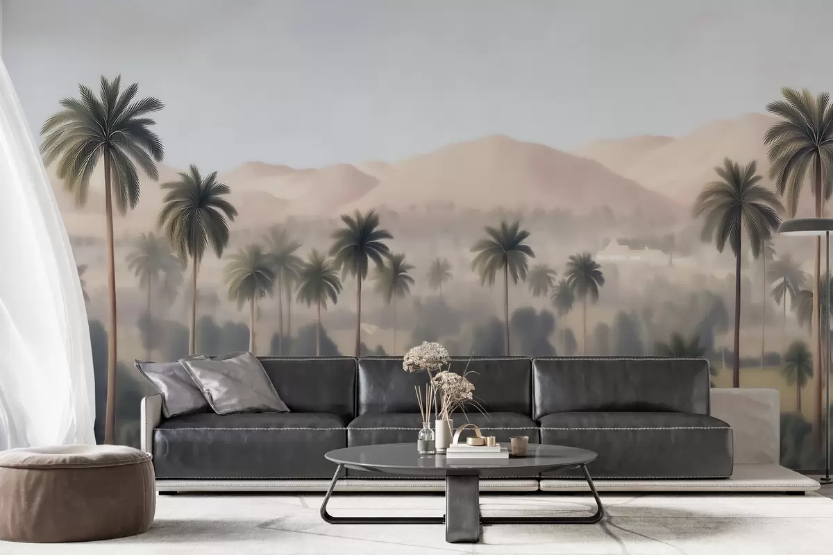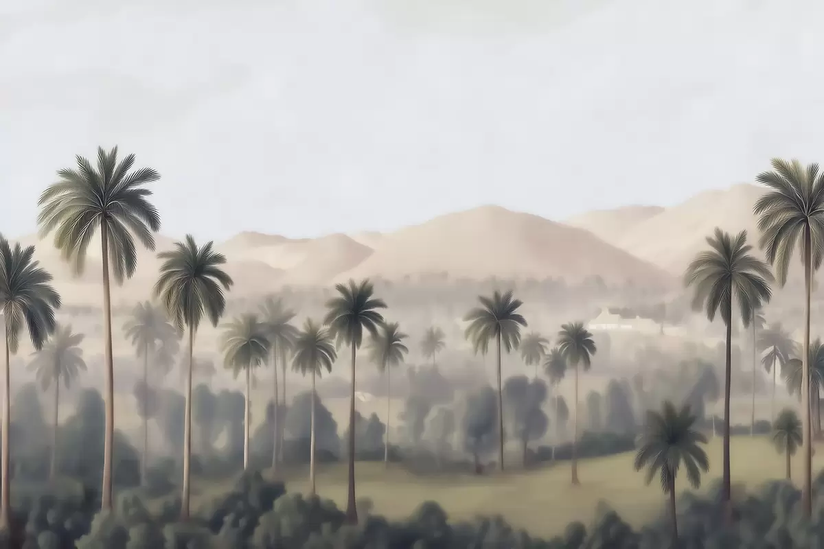 Fototapeten Tropische Landschaft mit Palmen und Bergen, Vintage-Panorama in Beige- und Grüntönen Nr. w09798