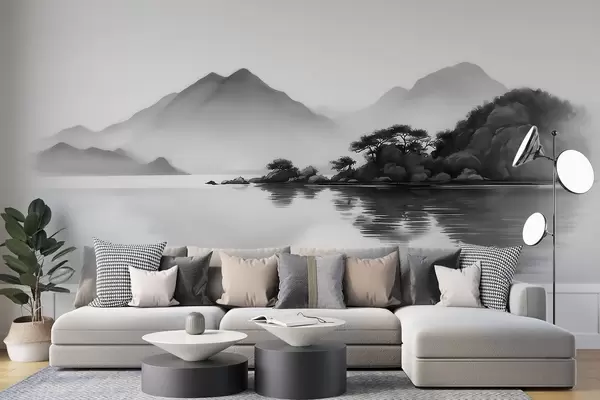Fototapeten Schwarz-Weiß-Landschaft mit Bergen und einem See im sanften Nebel Nr. w09803