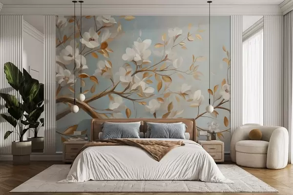 Fototapeten Strukturierter Ast mit weißen Blüten und gelben Blättern, im Vintage-Stil Nr. w09814